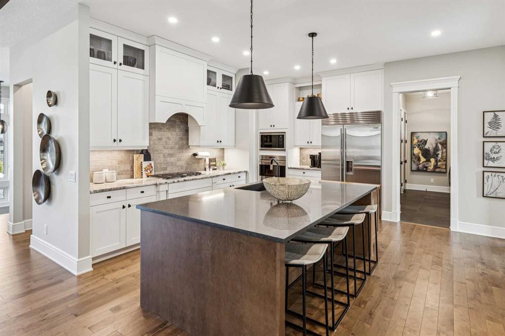 Welcome to a truly remarkable residence in the sought-after southwest community of Crestmont—a former Augusta show home showcasing extensive upgrades, refined craftsmanship, and a unique combination of luxury and functionality. Positioned on a generous corner lot with 3 bedrooms and rare 5-car garage, this highly coveted bungalow boasts more than 4,000 sq. ft. on two levels and offers an elevated lifestyle with thoughtfully designed spaces both indoors and out. The open-concept main level boasts 10\' & 11\' ceilings and is anchored by a stunning chef\'s kitchen, featuring extensive custom cabinetry, high-end Sub-Zero and Wolf appliances, and an oversized pantry—perfectly suited for both everyday living and elegant entertaining. Sunlight fills the space through transom windows, flowing seamlessly into inviting living and dining areas that open to multiple outdoor spaces. The primary suite on the main level is a private retreat of impressive scale, complete with its own southwest-facing deck. A spa-inspired ensuite with dual vanities, heated floors, a luxurious soaker tub and an expansive dressing room creates a serene, hotel-calibre experience. The main floor is complete with an executive style office featuring built-in desk and cabinetry, powder room and functional laundry & mudroom. Designed for entertaining and relaxation alike, the fully developed lower level offers two additional generously sized bedrooms, each with it\'s own full bath and an spacious recreation and games room. A sophisticated wet bar is complemented by a dedicated wine room, while a fitness room and hobby/craft room with second laundry area adds to the home’s lifestyle appeal. Outdoor living is equally exceptional, with multiple decks and private outdoor spaces, including a secluded walk-out cove featuring a hot tub. Outstanding landscaping includes feature rundle stone, wrought iron fence and back yard bordered by additional evergreen trees for enhanced privacy and year-round enjoyment. A standout feature rarely found: a five-car garage with room for vehicle lifts, and offering unparalleled storage, dog wash and flexibility for car enthusiasts or hobbyists. Situated in the coveted Crestmont community on Calgary’s west side, this home offers more than just luxury indoors. Residents enjoy access to an inviting HOA clubhouse, scenic parks and pathways, and sport courts for recreation and play. Retail destinations are conveniently close, and the location provides easy access to downtown Calgary as well as direct routes to the mountains, making daily life and weekend escapes effortless. This is a rare opportunity to own a statement property in Crestmont—perfect for empty nesters or those about to be - where luxury, privacy, and thoughtful design converge in one extraordinary home.