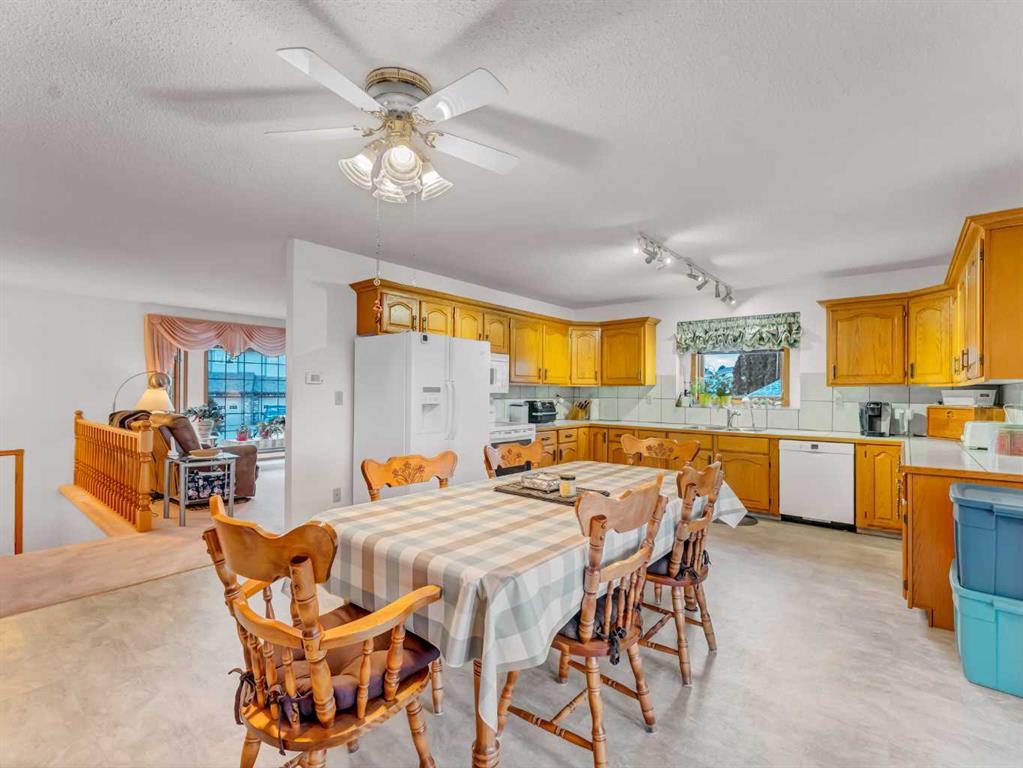 You are welcomed by a bright and airy living room that leads into a generous country-style kitchen, which can easily accommodate a dining table for up to twelve people, making it ideal for family gatherings. Patio doors open onto a large, covered, reinforced two-tier deck equipped with a gas line for BBQ hookup. This deck offers plenty of storage space below, overlooks a fully fenced, private backyard with underground sprinklers, a separate patio area with a gazebo, and a fantastic 18 x 28 heated garage/workshop with built in cupboards and 12 foot ceiling & door.