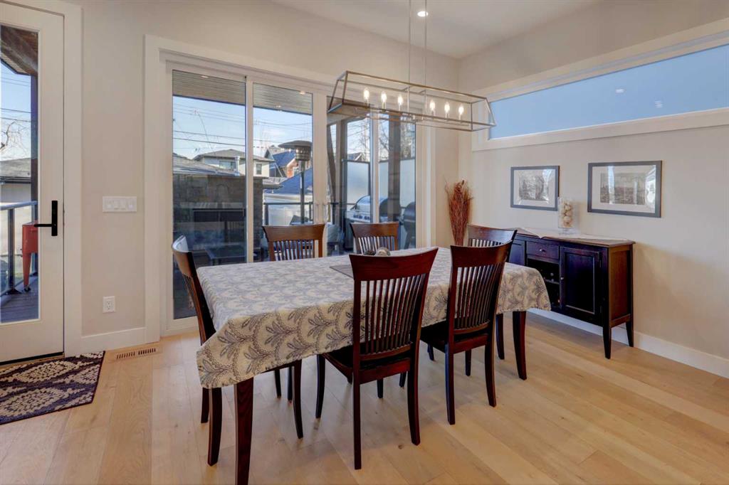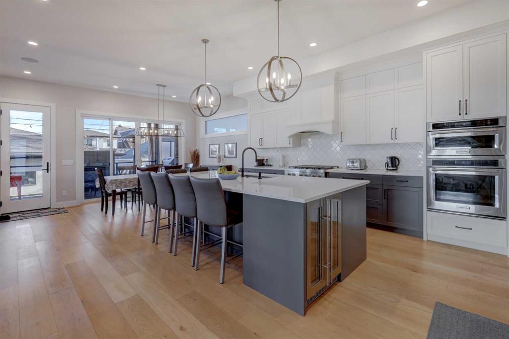 Luxury, location and thoughtful design come together in this exceptional custom-built home just five blocks from both Marda Loop and River Park. Built in 2021, this 2-storey home offers over 3600 sq. ft beautifully finished living space with downtown skyline views from the upper level. Set on a large, landscaped corner lot, the back yard features beautiful mature trees and amazing outdoor gathering spaces with a covered deck with gas fireplace, and large concrete patio with hot tub. The striking exterior showcases stucco, stone and faux-wood accents, wood beams and exposed aggregate steps and walkways, as well as Lumenox permanent outdoor lighting. The property includes underground sprinklers, gas bbq outlet and heated oversized double garage with epoxy floors and built-in shelves. Inside, natural light floods through large triple-glazed windows, highlighting hardwood floors on both the main and upper levels including the floating stairs. Eye-catching lighting throughout adds warmth and sophistication. The main floor features a private office with built-in cabinetry, a welcoming family room with coffered ceiling, linear gas fireplace, shelves and cabinetry, and a large and bright dining area. The chef’s kitchen is a showstopper, complete with Kitchen Aid appliances including gas stove, built-in oven and microwave, beverage fridge, a huge quartz island with granite sil sink, and a walk-in pantry with window and sliding door. Privacy blinds throughout allow light to pour in while maintaining comfort. The mudroom has been purposefully designed with a bench, cubbies, built-in shelves and cupboards, and even a built-in dog door! Upstairs, you’ll find a spacious bonus room with fireplace, built-in shelves, cabinets and desk; an upper laundry room with sink and cabinets; and a stylish 4 piece bathroom with tile floors and quartz counters. The luxurious primary retreat features a door to the private upper patio, and a large walk-in closet with barn door, built-ins and mirror. There’s a stunning 5-piece ensuite bathroom with marble-tile floors, dual sinks, luxurious soaker tub and large marble-tiled shower. Two additional bedrooms are finished with carpet, and include closet organizers. The fully developed lower level offers a gym with mirrored wall, fourth bedroom, full bathroom, and a rec room with built-in shelving, speakers, wet bar and barn door. The mechanical system is upgraded including a Daiken Multizone furnace, HRV, infloor heating, and oversized high efficiency hot water heater. The home includes central air conditioning and is wired for data, security and speakers throughout. This home boasts a super location, just blocks from River Park, river pathways, shops, restaurants, coffee shops & services in Marda Loop, and top rated schools. This is a rare opportunity to own a modern, luxury home in one of Calgary’s most sought-after inner-city communities.