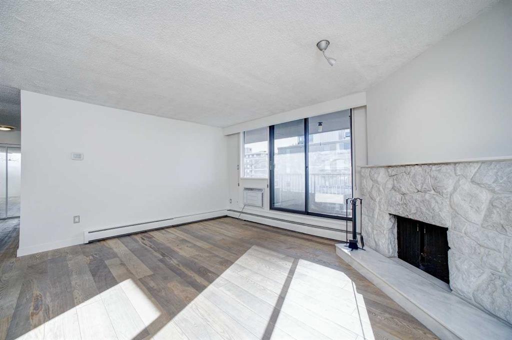 Spacious Top-Floor Unit with Massive South-Facing Balcony This penthouse unit in the concrete-constructed Hampton Court offers quiet, comfortable living in a premier location. The open-plan interior is move-in ready, featuring upgraded flooring and a functional kitchen with granite countertops and a large island. A natural marble-clad wood fireplace serves as a traditional focal point in the living area.