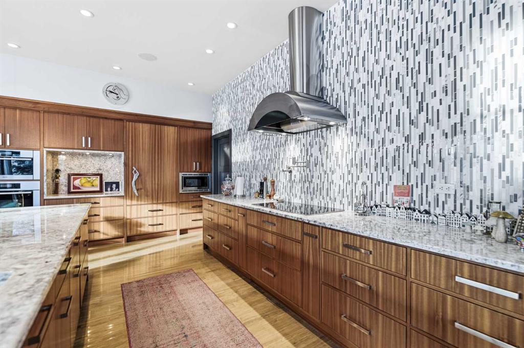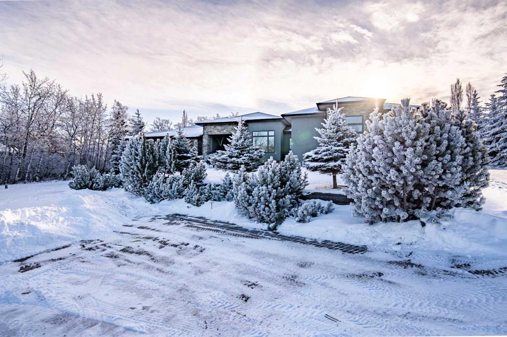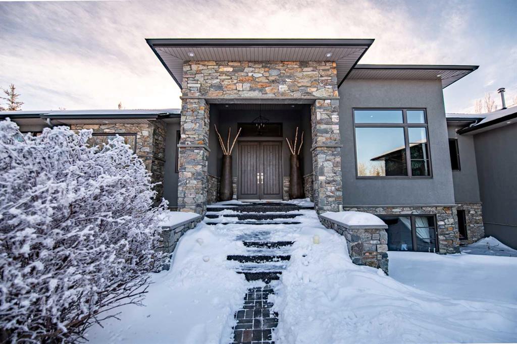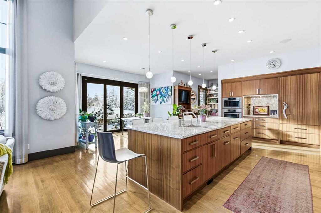 A sophisticated contemporary estate nestled on 1.93 acres, just minutes from the City. BUILT BY BOWOOD, this exceptional bungalow offers approximately 6,000 sq. ft. of refined luxury living, thoughtfully designed with extraordinary attention to detail throughout. A grand entrance welcomes you into the stunning great room, highlighted by a floor-to-ceiling gas fireplace framed by expansive corner windows, creating a bright and inviting space that sets the tone for this four-bedroom, five-bathroom residence. The open-concept layout seamlessly connects to a chef’s kitchen designed for the most discerning culinary enthusiast. Anchored by an impressive 11-foot granite island with prep sink and built-in dishwasher, the kitchen also features custom cherry wood cabinetry DESIGNED & BUILT BY SADONA CABINETS, a built-in refrigerator with designer hardware, induction cooktop, wall oven, steam oven, and a striking glass tile feature wall complemented by a sleek stainless-steel hood fan. A spacious butler’s pantry with a second dishwasher provides abundant storage and functionality. Off the great room, a walk-through coffee and tea bar leads into the elegant dining room, complete with floor-to-ceiling built-in cabinetry and a large picture window that floods the space with natural light. This bright and airy ambiance extends into the expansive 3 SEASON ROOM featuring vaulted wood-clad ceilings, west-facing windows, a wood-burning fireplace, and a built-in BBQ with hood fan—perfect for entertaining while overlooking the fully landscaped grounds. The luxurious primary suite is conveniently located on the main level and offers a SPA INSPIRED ENSUITE with a deep soaker tub, fully tiled shower, double vanity, and a generous walk-in dressing room with built-in features. Completing the main floor is a private office or additional bedroom, an oversized mudroom and laundry area, and a rare three-car attached garage with additional space for motorcycles or yard equipment. The lower level is designed for entertainment and relaxation, featuring a large TV and games room, wet bar, wine cellar, and dedicated home gym. This level also includes a bedroom with private ensuite, two additional spacious bedrooms, and a full bathroom. Additional highlights include a multi-zone Sonos sound system, whole-home water filtration, main-floor air conditioning, multi-zone in-floor heating, outdoor water feature, pizza oven, and RV parking. This architectural masterpiece is designed to impress, offering an exceptional lifestyle that will captivate guests and inspire everyday living.