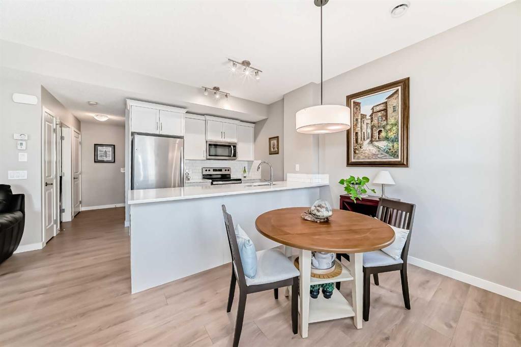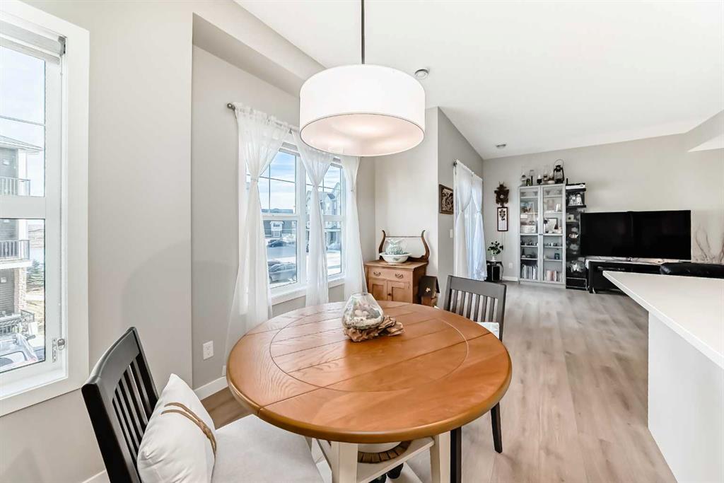 Welcome to this immaculate, upgraded townhome in the desirable community of Fireside, Cochrane, featuring peaceful pond and green space views that create a tranquil, nature-inspired setting. The bright, open-concept layout showcases a modern kitchen with quartz countertops, white European-style cabinetry with custom PULL-OUT shelving, stainless steel appliances, island with breakfast bar and PANTRY. Also features wide plank flooring, plush carpets, 9-foot ceilings, quartz counters throughout, and energy-efficient LED lighting. Large windows flood the home with natural light and patio doors open to two private balconies with views of the pond, ideal for morning coffee or evening relaxation. The home offers two spacious bedrooms, including a primary bedroom with a walk-in closet, a full bathroom and a stylish powder room, upper-floor laundry, ample in-unit storage, as well as a designated enclosed, heated storage unit and a titled parking at the side of your front door, just perfect for off loading groceries and everyday errands. Located in a well-managed, family-friendly complex close to schools, parks, walking paths, shopping, and recreation, with easy access to Calgary and approximately one hour from Banff and Canmore, this home delivers exceptional value and lifestyle.