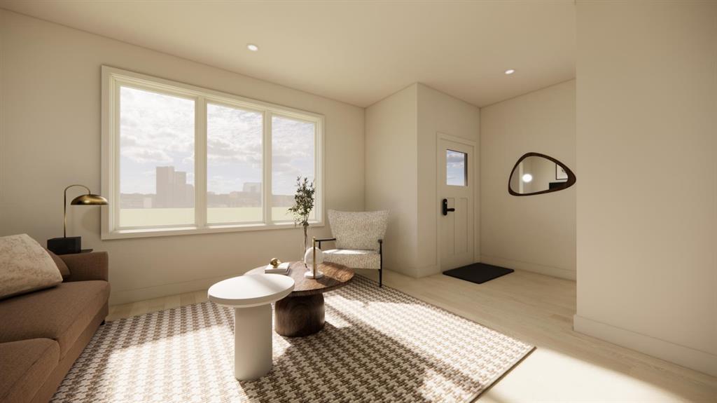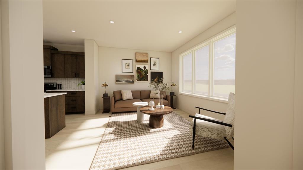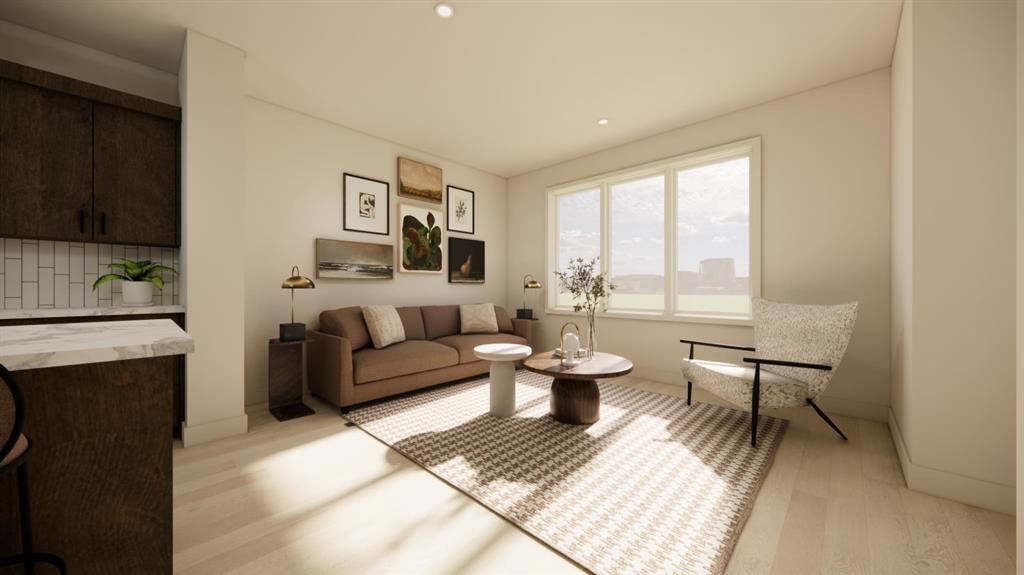 The main floor is designed for everyday living and entertaining, featuring an open-concept layout filled with natural light from oversized windows. The spacious living room flows seamlessly into the functional kitchen, complete with quartz countertops, soft-close cabinetry, and a central island with bar seating that anchors the space. Toward the back of the home, the formal dining area overlooks the backyard and double car parking pad, creating a practical and comfortable setting for family dinners or hosting friends.