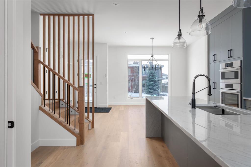 Inside, 10-foot main floor ceilings create a grand sense of arrival, setting the tone for the interior designer–curated colour palette carried throughout the home. Every detail has been intentionally explored, with the heart of the main floor anchored by a chef-inspired gourmet kitchen. Featuring a premium Bosch appliance package, fully custom-painted cabinetry, and an oversized waterfall granite island, the space effortlessly blends luxury with everyday functionality. A dedicated front dining room offers a warm setting for gatherings, while the rear living room provides a more intimate retreat, centered around a full feature-wall gas fireplace—perfect for evenings spent unwinding. Thoughtful storage solutions are seamlessly integrated, including built-ins at the entry and a fully custom mudroom at the rear, ensuring every inch of space is maximized. Ascending to the upper level, subtle design moments continue to impress, with a full wood feature wall, custom stair lighting, and luxury wide-plank hardwood flooring flowing continuously throughout both the main and upper levels for a seamless transition.The oversized primary bedroom is a true sanctuary, showcasing a vaulted and peaked ceiling design with expansive windows that welcome morning light. The spa-inspired ensuite features a dual vanity, an expansive full-tile shower, and a calming, private retreat. Two additional bedrooms offer generous proportions, each complete with custom closet built-ins. The upper-level laundry room maintains the home’s commitment to efficiency and design, offering full cabinetry, a folding counter, side-by-side washer and dryer, and a laundry sink. A versatile work-from-home alcove completes the upper floor, easily functioning as a den or secondary living space.The lower level further extends the home’s flexibility with an oversized 2-bedroom, 1-bath legal suite, centered around a spacious open kitchen—ideal for rental income, guests, or multi-generational living. A separate full laundry room, understair storage, and built-ins throughout each closet ensure the same level of thoughtful design continues below.Perfectly positioned close to inner-city Calgary, recreation centres, shopping, and public transit, this Killarney residence offers a timeless blend of form and function—designed to live beautifully today and adapt effortlessly for tomorrow.