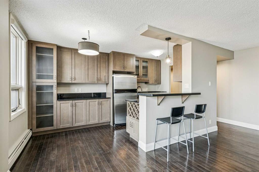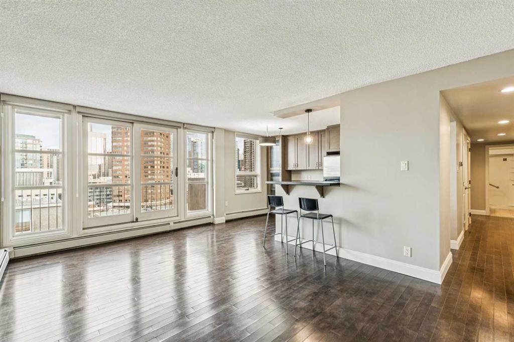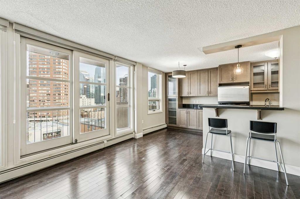 Located in the heart of the Beltline, this 2 bedroom condo at Centro 733 blends smart design with everyday livability. An open floor plan creates an effortless flow for everyday living while hardwood flooring adds warmth and durability for a low-maintenance lifestyle. Floor-to-ceiling windows frame sweeping views of downtown and the Calgary Tower, (brand new roller blinds) drawing natural light deep into the space and creating a dynamic backdrop from morning through evening. An inviting living area encourages relaxed evenings or lively gatherings, with patio doors extending the experience outdoors for a seamless indoor and outdoor lifestyle. A covered balcony becomes an extension of the home, offering space for summer barbeques while overlooking green space, city skylines and iconic tower views that elevate every moment. A dedicated dining area is well positioned for entertaining, with clear sightlines that support easy conversation and connection. A sleek, modern kitchen inspires culinary creativity with Amana stainless steel appliances, full-height cabinetry for efficient storage, stone countertops for everyday durability and a breakfast bar that invites casual meals or social interaction. 2 spacious bedrooms provide flexibility for rest, guests or a home office, while a modern 3-piece bathroom delivers clean lines, new shower and practical comfort. Centro 733 is a concrete building known for its quiet atmosphere and endless amenities including a well-equipped fitness room and a large party room with a full kitchen, ideal for hosting without sacrificing private space. Low condo fees enhance everyday value by including electricity, heat and water. A premier setting directly across from the historic Lougheed House places green space and heritage charm at your doorstep, while vibrant 17th Avenue sits just steps away with its nightlife, diverse boutiques, award-winning restaurants and cafés. Daily conveniences are equally close, with grocery stores, transit access, Memorial Park, the Elbow River pathways and the Talisman Centre all within easy reach, creating a walkable, connected lifestyle perfectly suited to professionals, downsizers or investors seeking function, location and long-term appeal.