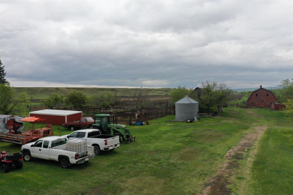 An older farmstead remains on the property, complete with corrals, barns, workshop, and a large historic homestead heated by coal, with electricity, water well, and septic field already in place—providing a functional base for agricultural use, renovation, or future vision.