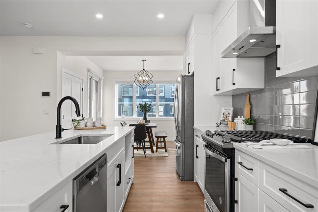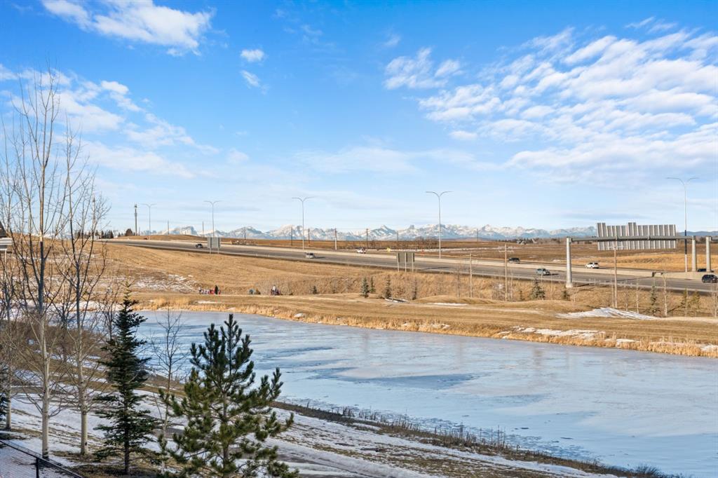 Tucked away in the sought-after community of Crestmont, this exceptional 2,050+sqft townhome with numerous upgrades offers a rare combination of privacy and beautiful views. Looking onto a tranquil pond with uninterrupted mountain views, this home delivers front-row seats to golden prairie sunsets and ever-changing skies. With no unit attached to the back - a rarity within the complex - the sense of openness and connection to nature is truly special. A charming front porch welcomes you home, while 2 balconies allow you to enjoy the views at different times of day - from peaceful morning coffee to evenings spent watching the sun dip behind the Rockies. The oversized single garage offers ample room for storage, bikes, and outdoor gear, supporting an active lifestyle. The entry level features a large and versatile recreation room, ideal for movie nights, a home gym, or a flexible family space. This level also offers direct outdoor access, allowing guests to conveniently park nearby and enter the home with ease. Just steps from your door are parks, pathways, and the pond, perfect for dog owners and nature lovers. The main floor is a standout, designed to maximize both functionality and the spectacular setting. The spacious living room is anchored by a sleek fireplace (upgrade) and opens onto a large covered deck with sweeping mountain and pond views and a gas line for your BBQ - an incredible space for entertaining or simply unwinding as the sunset unfolds. The chef-inspired kitchen features a massive island, quartz countertops, gas stove, black plumbing fixtures , Blanco sink and a generous pantry with double doors. The spacious dining area opens to a 2nd east-facing balcony - the perfect spot to greet the morning sun, while a convenient powder room completes the level. Luxury vinyl plank flooring, central air conditioning, modern upgraded lighting, triple-pane windows, and hard-wired internet connectivity throughout the home elevate both comfort and performance. Upstairs, the third level offers 3 bedrooms, including a primary retreat with more amazing views. The primary ensuite features double vanities and a spacious shower, complemented by a walk-in closet. Laundry is conveniently located on this level alongside a full 4-pc bathroom, ensuring effortless day-to-day living. This home is in like-new condition and includes a tankless hot water heater, lower monthly utility costs, supported by its efficient EnerGuide rating, and Built Green Canada certification. The location is exceptionally convenient, with quick access to Stoney Trail for easy commuting downtown or seamless escapes to the mountains, and all major city routes close at hand. Shopping and daily amenities are right in the complex, while the Calgary Farmers Market is just a few minutes away. Crestmont is a wonderful place to call home and features a community centre, waterpark and playgrounds. Click on the link for the virtual tour!