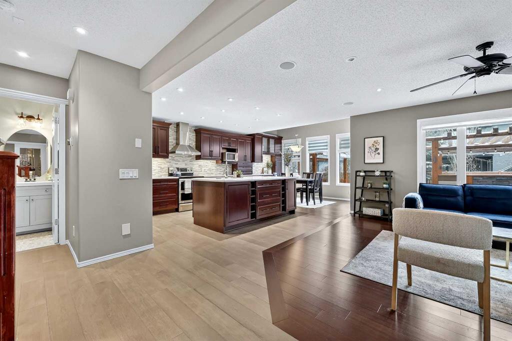 Welcome to this well cared for and upgraded family home in Panorama Hills! Offering over 2,900 sq ft of developed living space designed for comfort, entertaining, and everyday living. The bright, open concept main floor features gleaming hardwood flooring throughout and is filled with natural light. A main floor office, updated 2-piece bathroom, and laundry area with sink add functionality for busy households. The heart of the home is the $50,000 fully renovated kitchen, complete with custom cherry wood cabinetry, crisp quartz countertops, tile backsplash, pantry, large center island with undermount sink, and upgraded stainless steel appliances: including a dual oven and water-dispensing refrigerator. The kitchen opens to the dining area with extended cabinetry, 10-foot ceilings and a garden door leading to a newly built $55,000 Hawaiian themed two-tiered composite deck with custom wood pergolas, creating an ideal outdoor entertaining space! The large living room is anchored by a floor-to-ceiling stone faced fireplace and features a large picture window overlooking the sunny SW backyard. Upstairs the huge, vaulted bonus room offers a flexible space for a kids play area, games room, or movie room! The spacious primary bedroom features a spa-inspired ensuite with tile flooring, soaker tub, seperate shower, and a walk-in closet with custom organizers. Two additional well-sized bedrooms and another full 4-piece bathroom complete the upper level. The fully finished basement expands the living space with a large recreation room with full wet bar, spacious fourth bedroom, and full bathroom, perfect for guests or entertaining! Additional highlights include central air conditioning for those hot summer days and an oversized 21.5\' x 21.5’ double attached garage. Also, brand new roof shingles, fascia, and eaves completed in Fall 2025! Prime location on a quiet cul-de-sac adjacent to the ravine pathways and surrounded by parks, schools, shopping, and transit! Quick access in and out and to Stoney Trail ring road, making commuting a breeze. This move-in-ready home offers exceptional value in one of NW Calgary’s most established and sought after communities.