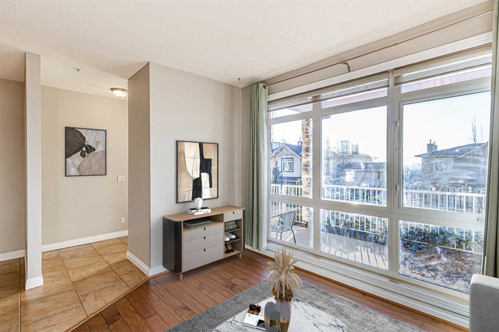 This immaculate 1 bed, 1 bath unit in Blue Sky is a true gem, perfectly blending modern finishes with functionality. The unit features new quartz countertops in the kitchen and bathroom, newer stainless steel appliances, fresh paint, gorgeous maple hardwood in the living and bedroom areas, and stylish tile in the kitchen and dining room. The open floor plan includes a bright living room with floor-to-ceiling windows and an inviting view of the outdoor space. Additional highlights include in-suite laundry, a spacious 4-piece bathroom, and a large bedroom with a walk-in closet and patio door leading to a private outdoor patio. Enjoy the convenience of two patios (with SW and NW exposure), allowing you to soak up the sun at any time of day. Ample storage options are available, including an additional locker for skis and bikes, as well as one secure underground parking stall. The complex is pet-friendly (with board approval) and features fitness facilities, a social room, and an inviting front patio equipped with a BBQ outlet, perfect for entertaining. This unit truly has it all and shows a perfect 10/10. Located close to schools, shops, restaurants, the Tuscany LRT station and a quick escape to the mountains. Don’t miss your chance to make this beautiful condo your new home!