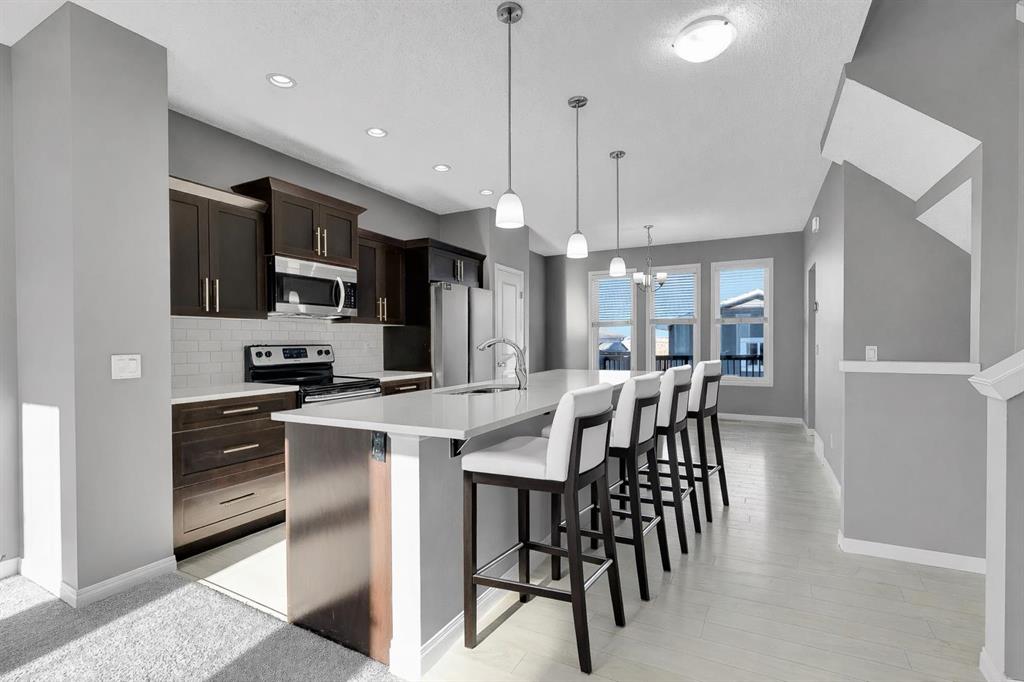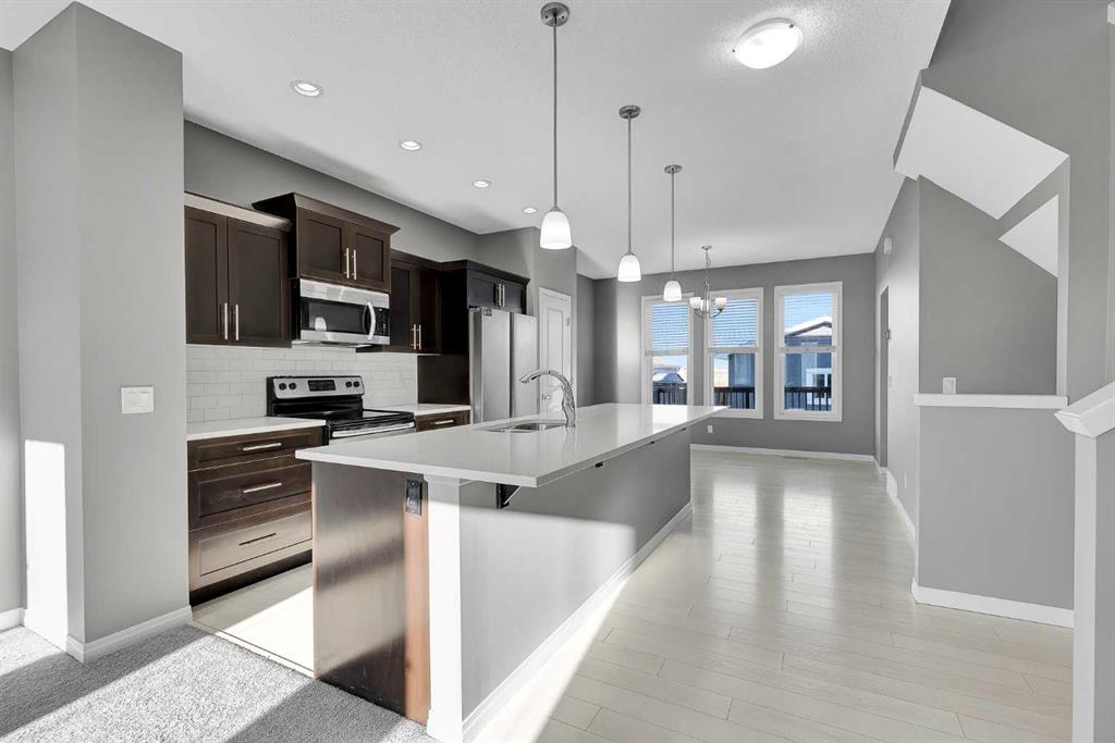 Modern upgrades and bright, functional living come together in this fully finished and MOVE-IN READY 2-storey detached home in the award-winning lake community of Mahogany. Offers 3+1 bedrooms, 3.5 bathrooms, a double detached garage, a fully developed basement and fresh paint throughout. Central A/C for those hot summer days. Quick possession available! The open-concept main floor is warm and welcoming, featuring a sun filled-living room with 9 ft ceilings and brand new carpet. a well-appointed central kitchen with a large quartz island, ample cabinetry, generous counter space, and SS appliances including a brand new fridge. Spacious dining area opens directly onto a huge 12x20 deck with gas hook-up for BBQ—perfect for summer entertaining, outdoor dining, or relaxing evenings in the private and fenced backyard (no neighbours behind). A convenient 2-pc bathroom completes the main level. Upstairs, the primary bedroom offers a private retreat with a walk-in closet and 4-piece ensuite, and a sunny balcony is great for morning coffee or reading a book. Complemented by 2 additional bedrooms and another full bath on this level. The fully developed basement adds excellent versatility with a large family/rec room, a 4th bedroom, and a 4pc bath—ideal for guests or a home office. Lots of storage space in the mechanical room and under the stairs. Outside, the backyard leads to the double detached garage, providing both parking and extra storage. Ideally located with easy access to Mahogany’s lake and beaches, residents enjoy amazing four-season amenities, plus access to nearby schools, parks, playgrounds, scenic pathways, and quick access to Mahogany Village Market, shopping, restaurants, transit, and major roadways. An outstanding opportunity to enjoy lake living at its best!