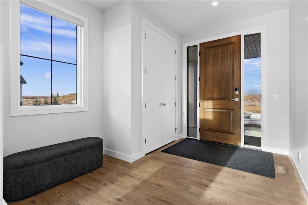 A beautifully crafted 2025-built Amber model by Sterling Homes, ideally situated on a premium corner lot in the sought-after community of Harmony. Offering over 3,750 sq ft of fully developed living space, 5 bedrooms, and more than $120,000 in upgrades, this home is truly exceptional. Barely lived in and meticulously maintained, it shows like new and is ready for immediate possession. The modern stone exterior and clean architectural lines create a striking first impression, while the corner-lot placement allows for large windows throughout and an open, airy feel. Located directly across from green space and pathways, the setting offers privacy and a strong connection to the outdoors. Inside, the open-concept main floor is designed for everyday comfort and entertaining, featuring soaring ceilings and wide plank flooring throughout the main and upper levels. The living room is anchored by a stunning floor-to-ceiling fireplace that serves as a statement feature, adding warmth and architectural presence. A private main-floor office and stylish powder room add functionality without disrupting the flow. The kitchen is the heart of the home, designed for gathering and hosting, with quartz countertops, an oversized island, stainless steel appliances, a beverage fridge, and a walk-in pantry, all open to the main living and dining areas. A custom mudroom with built-ins off the double attached garage keeps daily life organized. Upstairs, the home opens to below, enhancing the sense of space. The primary retreat offers a peaceful escape with large windows, including an additional upgraded west-facing window positioned to capture sunset and mountain views, a spacious walk-in closet, and a spa-inspired 5-piece ensuite with quartz countertops, a freestanding soaker tub, and a walk-in shower with built-ins. Two additional generously sized bedrooms with walk-in closets are located on the opposite side of the level, alongside a well-appointed 5-piece bathroom. The bonus room features built-in benches and large windows overlooking the green space and park, creating an inviting space for relaxed family time, while the upper laundry room is conveniently located nearby. The fully finished basement completes the home with a large recreation area perfect for games nights and entertaining, a wet bar, and double French doors leading to a versatile space ideal as a private theatre, home office, or guest room, along with a fifth bedroom and full bathroom. Built with family living in mind, this home offers generous spaces and a layout that supports everyday routines. Outside, a rear deck invites summer evenings, while the unfinished landscaping provides a blank canvas for your outdoor vision. All of this is paired with the exceptional amenities Harmony is known for, including lake access, golf, scenic pathways, and a vibrant community atmosphere.