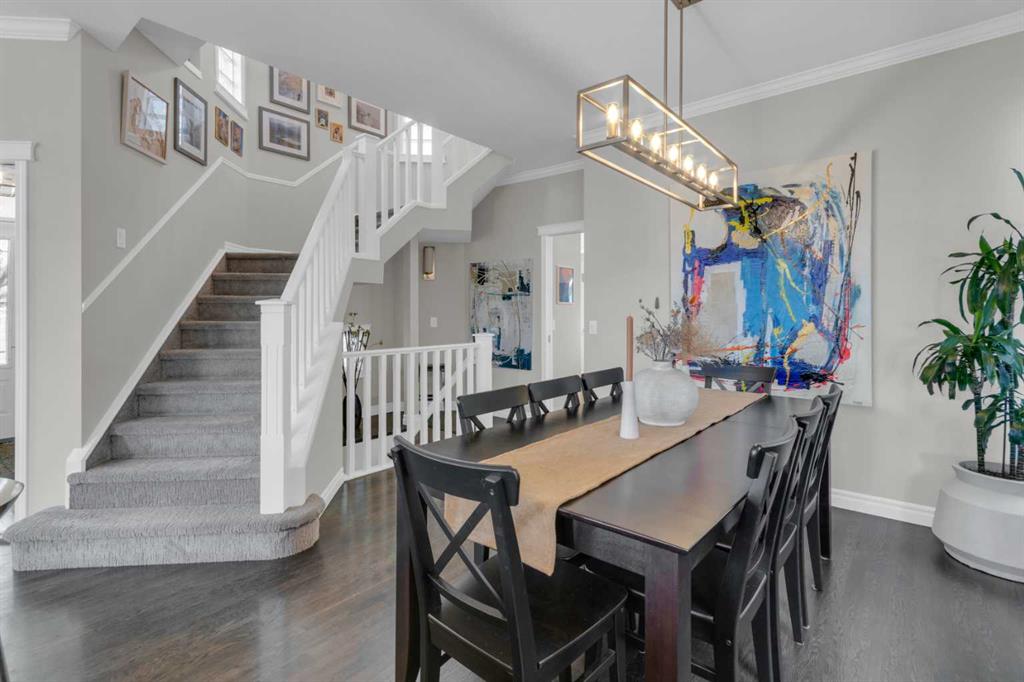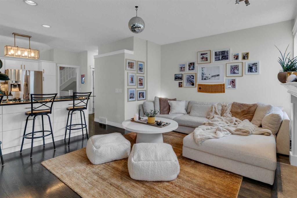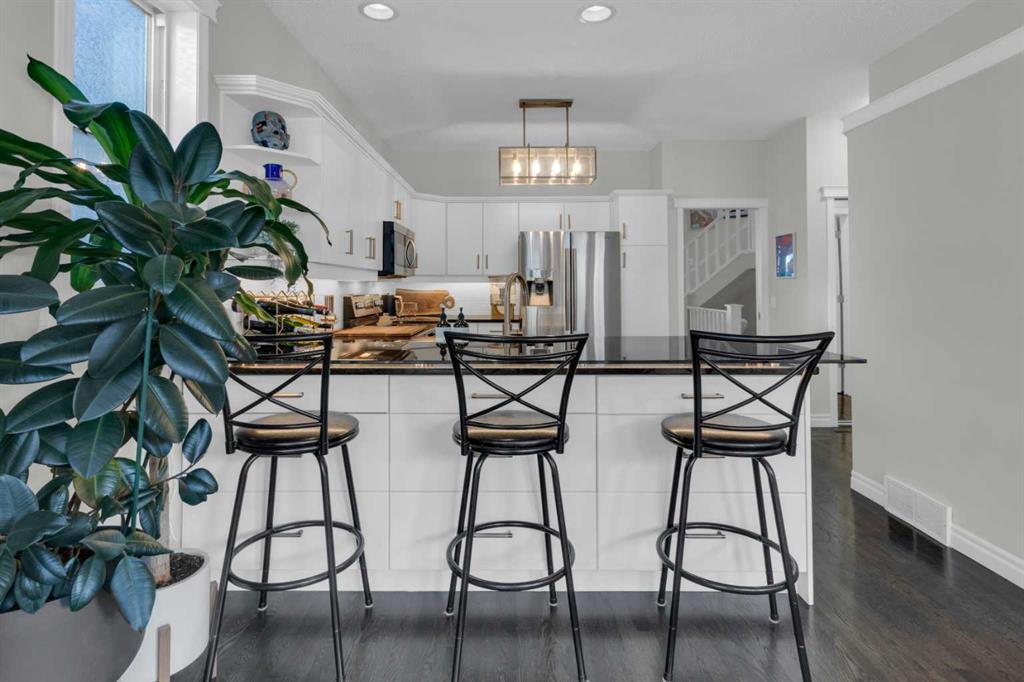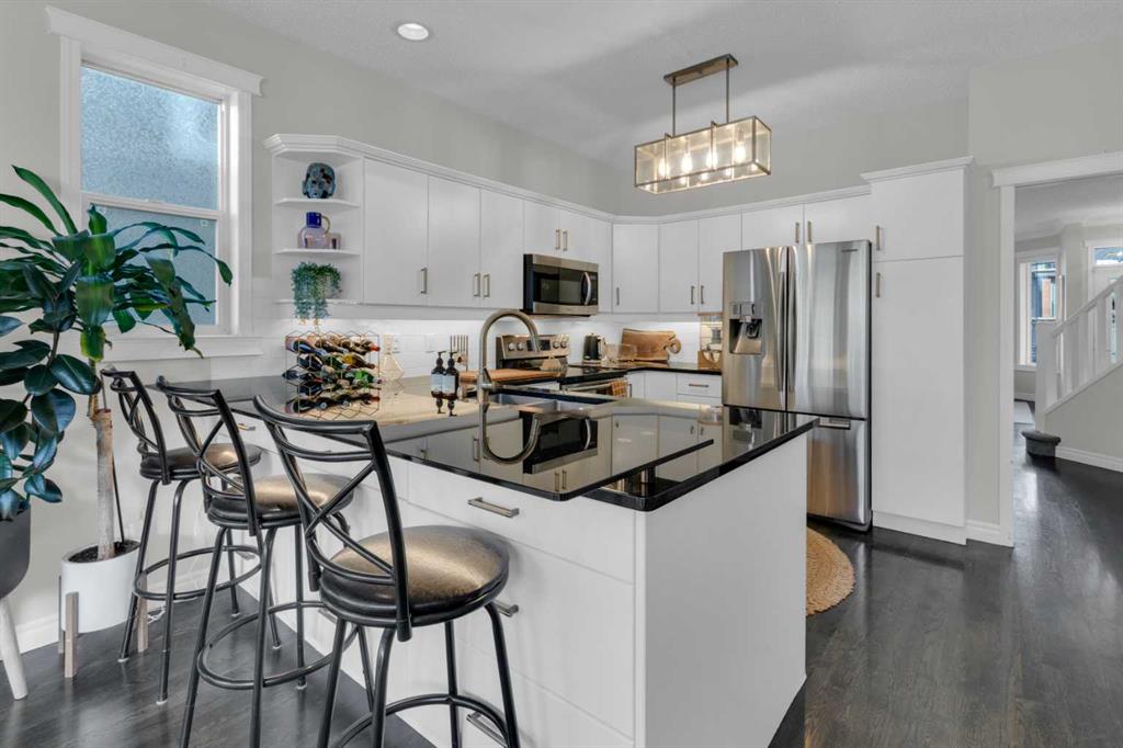 Walking up to the house you\'ll find a durable composite inviting porch where you can sip your morning coffee, or see the view of downtown in the distance and watch the Calgary Stampede, Canada Day and New Year\'s Eve annual fireworks at night. This unique inner core home is just a 10 minute drive from downtown, a 5 minute walk from restaurants and more on 4th street, It\'s just a 5 minute walk two blocks up to a gorgeous ridge with pathways and Elbow river access overlooking Stanley park. Also within walking distance, is the off leash Roxboro dog park. Once stepping inside the home, you are greeted by an open-concept living and dining area featuring soaring 9 ft ceilings, elegant crown moldings, and site-finished oak hardwood floors. The timeless chef’s kitchen is a focal point, finished with premium granite countertops, stainless steel appliances and a newer Bosch dishwasher. In your kitchen you\'ll find a custom eating bar perfect for morning coffee or evening entertaining. Underneath the custom bar are six large drawers perfect for concealed but stylish storage. All of the hardware on the cabinets and drawers are elevating gold additions from Banbury Lane. Relax in the adjacent family room with a wall of large, bright windows anchored by a cozy fireplace for those chilly Calgary nights. Your upper level is a sanctuary. You\'ll ascend to the second floor on a vaulted staircase to find three well-sized bedrooms. Each bedroom has new black-out-blinds and two of these rooms also feature dramatic vaulted ceilings as in the beautiful primary bedroom, creating the feeling of airy, expansive peace. The primary ensuite is a true private retreat, with it\'s expansive arched window bringing the outside in, while also boasting a walk-in-closet, a dual vanity and a deep jetted tub—the perfect place to unwind.