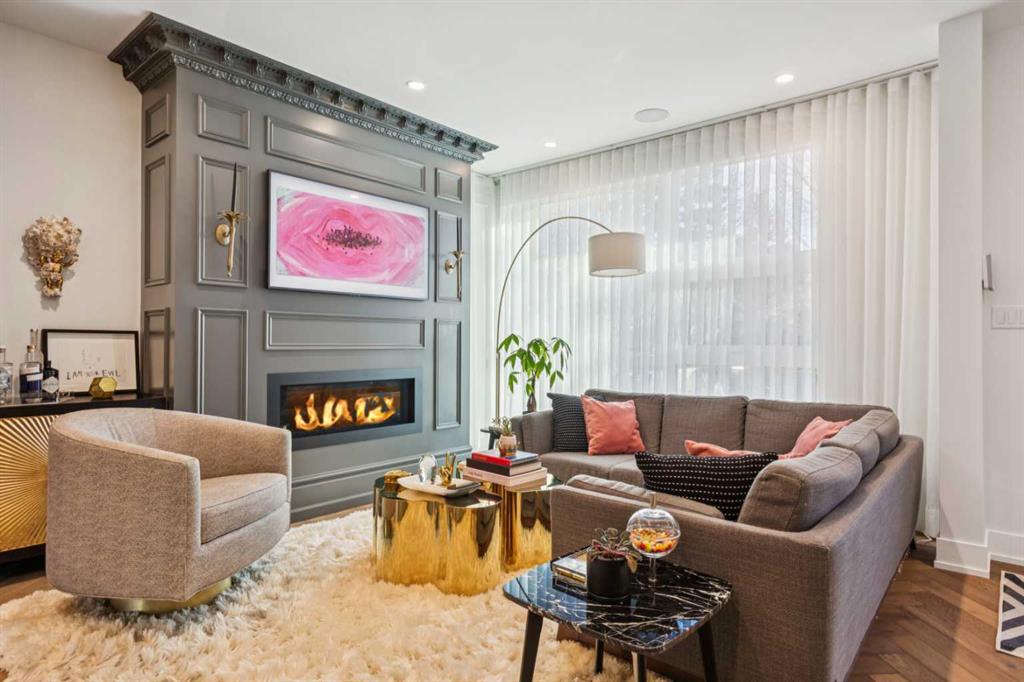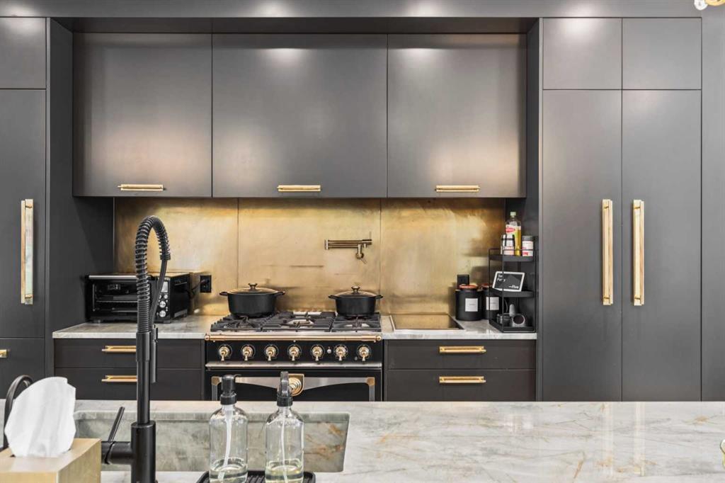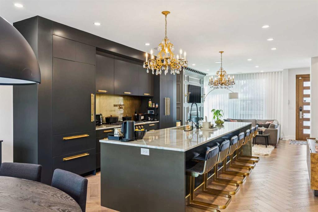 Exceptionally high-quality home in sought-after Parkhill, just a few doors from the Ridge Park with access to the Elbow River pathway system. Enjoy a walkable lifestyle minutes from the vibrant 4th Street Village, offering an endless array of shops, dining, and services, along with proximity to excellent schools. This stunning contemporary residence showcases impeccable design and craftsmanship with bespoke architecture by Marvin DeJong and an incredible array of upgrades. Brick, metal, and stucco create a striking curb appeal punctuated with a custom 2.5” solid oak and glass front door. 3,096 sq ft of developed living space including 4 bedrooms and 3.5 bathrooms. The totally open-concept main floor features high ceilings, exceptional natural light from the oversized front and rear windows and custom herringbone hardwood floors. The living room is anchored by a custom-paneled fireplace with “frame” television and soft floor-to-ceiling sheers. Truly incredible chef’s kitchen with extensive custom cabinetry, quartzite counters and a massive “waterfall” island with seating. Top appliances include: a La Cornue gas stove, Subzero fridge plus 2 fridge drawers, 2 Subzero freezer drawers, 2 Subzero wine fridges, Wolf Induction burner, 2 dishwashers and a custom fabricated quartzite sink. The generous dining area with designer lighting and built-in storage overlooks the rear yard . A mudroom with heated floor and excellent storage and a discreet, elegant powder room complete the main level. Striking staircase with glass wall and solid wood treads leads to the upper floors…no carpet in the home. The primary suite features blackout drapery, wall-mounted TV and a well-organized walk-in closet. The spa-inspired ensuite showcases heated custom marble flooring, designer lighting, Kateryn cast iron soaking tub, zero-threshold shower with steam, water closet with Japanese bidet toilet and a large double vanity with honed marble counter and Restoration Hardware fixtures. The balance of the second level includes two bright bedrooms (one currently used as a dressing room), a spacious house bath and a walk-in laundry room with sink and storage. The top-floor holds both a large studio space with amazing light quality and an office area with access out to a large and private terrace. The fully finished lower level offers heated hardwood floors, a media space, games room, work station, bedroom and a full bath. Outdoor living is equally impressive with a front terrace with perennial-rose garden and a sunny west-facing and low-maintenance back yard with multiple patios. Additional highlights include a smart home system that controls Lutron lighting, temperature and security, a sprinkler system and Gemstone exterior lighting. The fully finished and heated double garage has 2 EV chargers and enjoys a paved alley. This exceptional property must be seen to be appreciated.