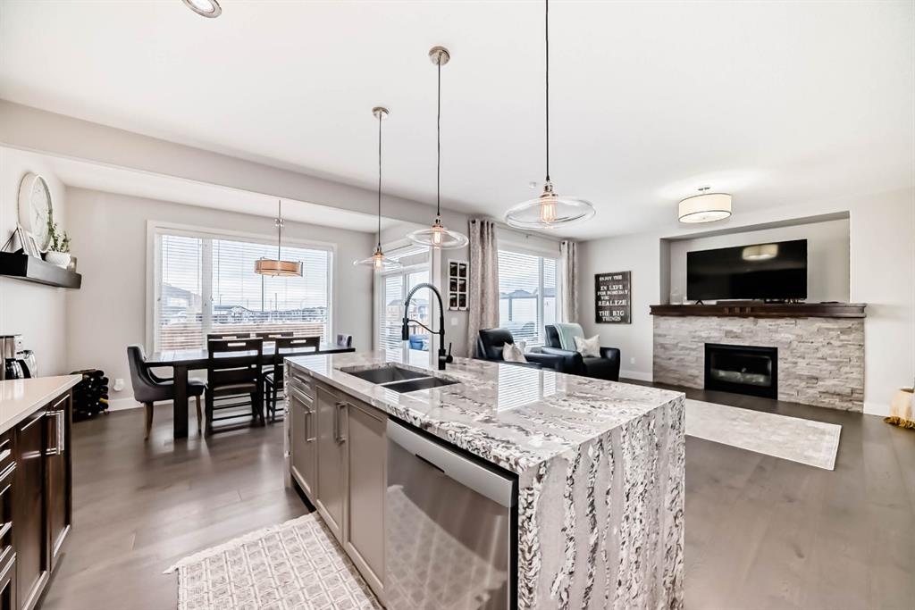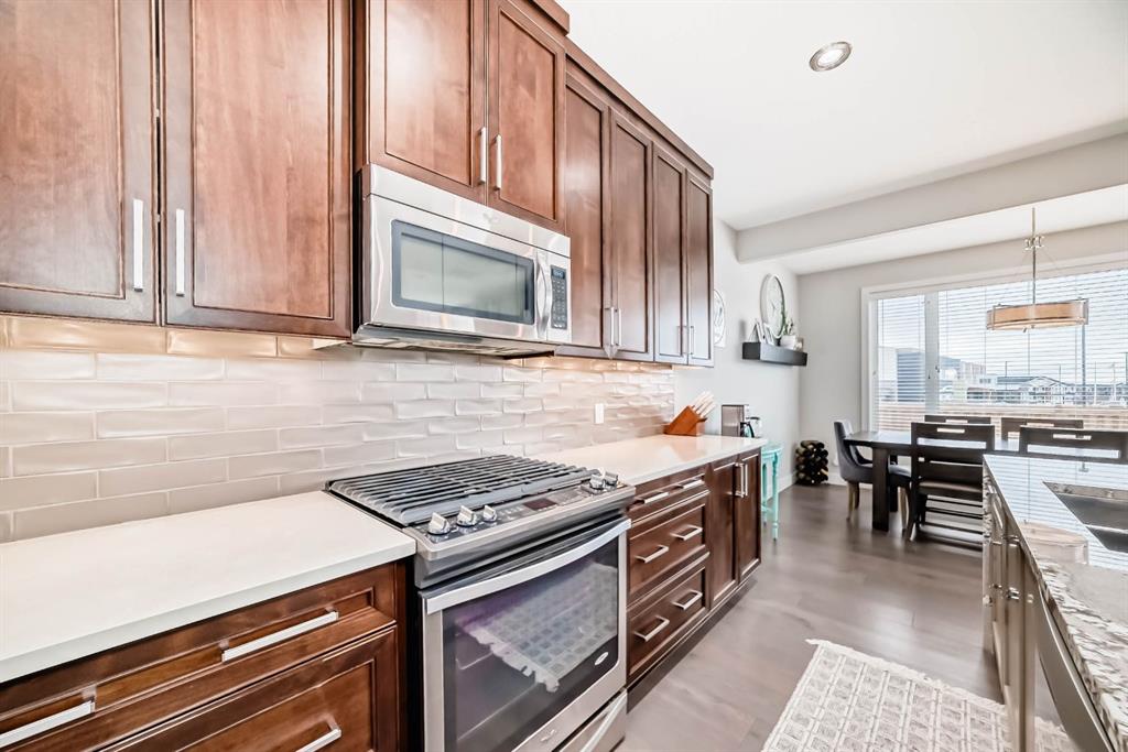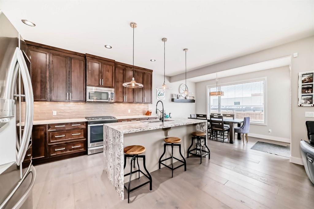 Originally a Janssen Showhome and still with the original owners, this impeccably maintained property was built in 2015 but not occupied until 2018. Step into the spacious foyer and immediately notice the soaring 9-foot ceilings and impressive 8-foot doors on both the main and upper levels. Rich hardwood flooring flows seamlessly into the open-concept living and kitchen areas. The kitchen features custom wood cabinetry with under-cabinet lighting, a brand-new stainless steel appliance package including a gas stove, and a stunning granite waterfall island. The large dining nook leads out to a beautifully landscaped backyard. Enjoy outdoor living with a new composite deck, privacy fencing, a stamped concrete patio, and a hot tub—perfect for entertaining or relaxing. A 6-foot wooden fence provides exceptional privacy all around. Back inside, the walk-through pantry conveniently connects to the oversized, heated garage, which offers ample storage options. Upstairs, the central bonus room—with peak-a-boo mountain views—creates a great separation between two spacious front bedrooms, a 4-piece bathroom, a 3rd bedroom currently used as a home office, and the impressive primary retreat at the rear. The luxurious 5-piece ensuite includes a glass-enclosed, heated shower and a walk-in closet outfitted with custom built-ins.