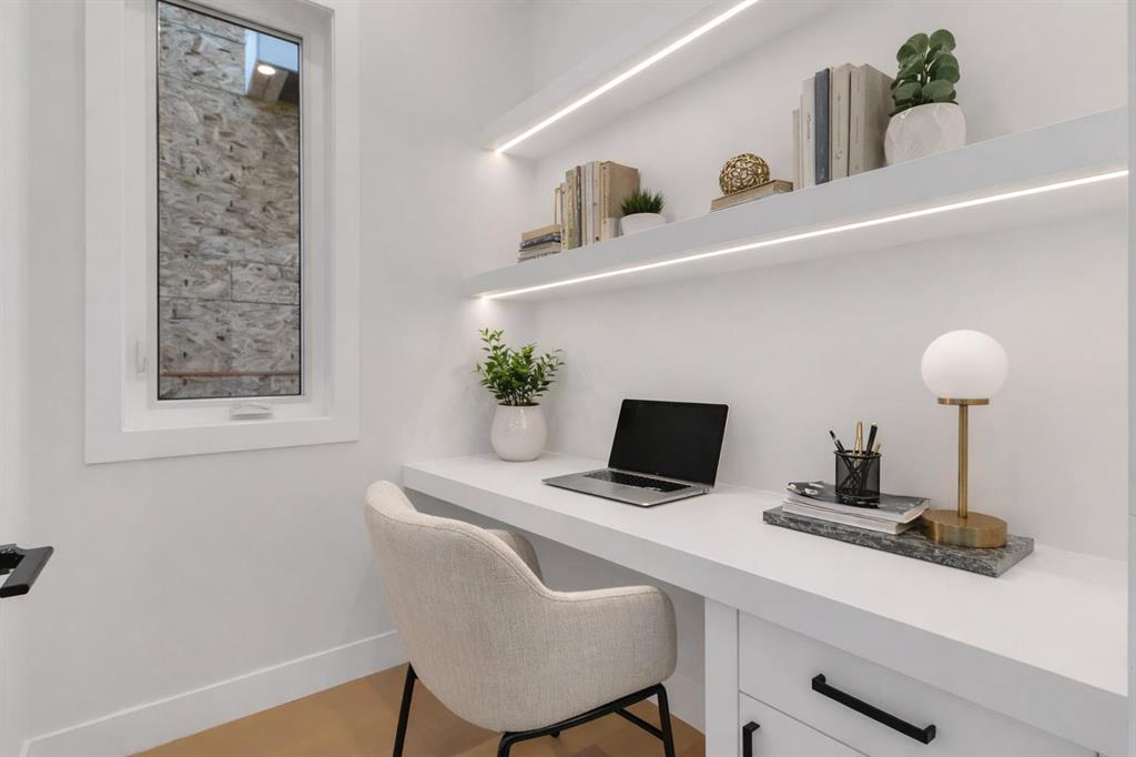 The chef inspired kitchen is a true showpiece, featuring a massive quartz island, built in Frigidaire Professional Series appliances, a custom slat hood fan, bar fridge, and extensive full height cabinetry with pull out storage. Integrated LED lighting throughout the kitchen, including toe kick, under cabinet, floating shelf, and glass front upper lighting, adds both function and ambiance. A dedicated home office with a built in desk and under lit floating shelves is positioned near the entry. At the rear, a well designed mudroom with bench seating and coat hooks leads to a stylish powder room with a floating vanity and pendant lighting.