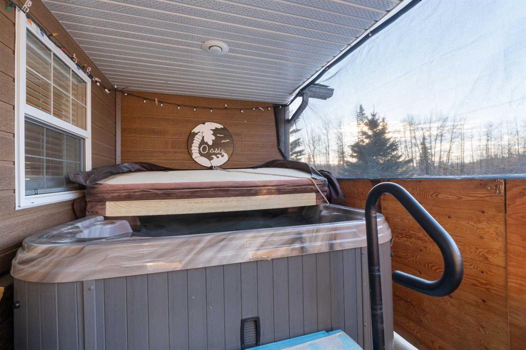 Located just west of Whitecourt on Old Ferry Road with pavement right to your driveway, this well-maintained 2,026 sq. ft. slab-on-grade bungalow offers the perfect mix of country privacy and functional, one-level living. Built in 2007 on 4.99 acres with the rare perk of town water, the home features an open-concept main area with tall vaulted ceilings and a massive kitchen boasting 30 feet of counter space, a pantry, and a floating island. The layout includes three large bedrooms, highlighted by a primary suite with a large ensuite and walk-in closet, plus a dedicated laundry room leading to the double 22\'x31\' attached garage. Staying comfortable is easy with a 3-zone in-floor heating system, forced air for quick temperature control, and a corner gas fireplace in the living room. Outside, the durable Hardie Board exterior includes a private back deck and a front porch that houses a large included hot tub. more outbuildings also included. Complete with a handy 2-piece bathroom in the garage and close proximity to the McLeod River for fishing and tubbing, this home is a solid, no-stairs option for anyone looking for space and ease of living.
