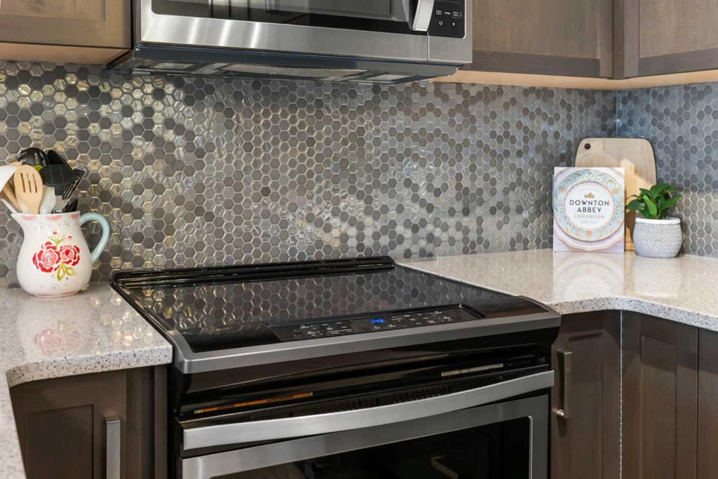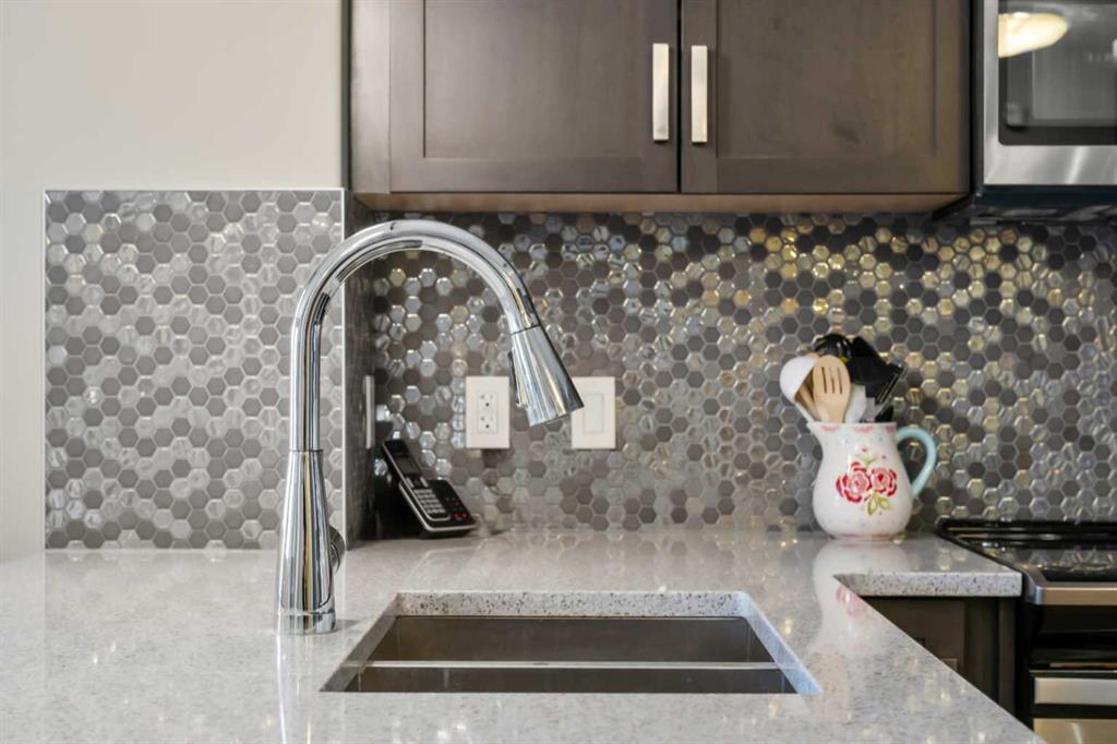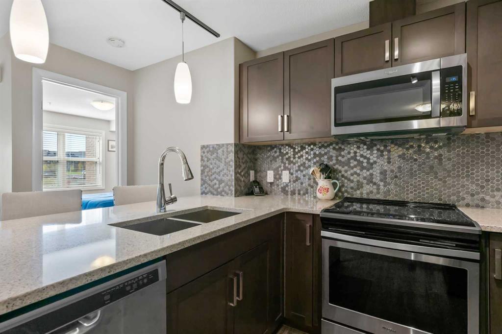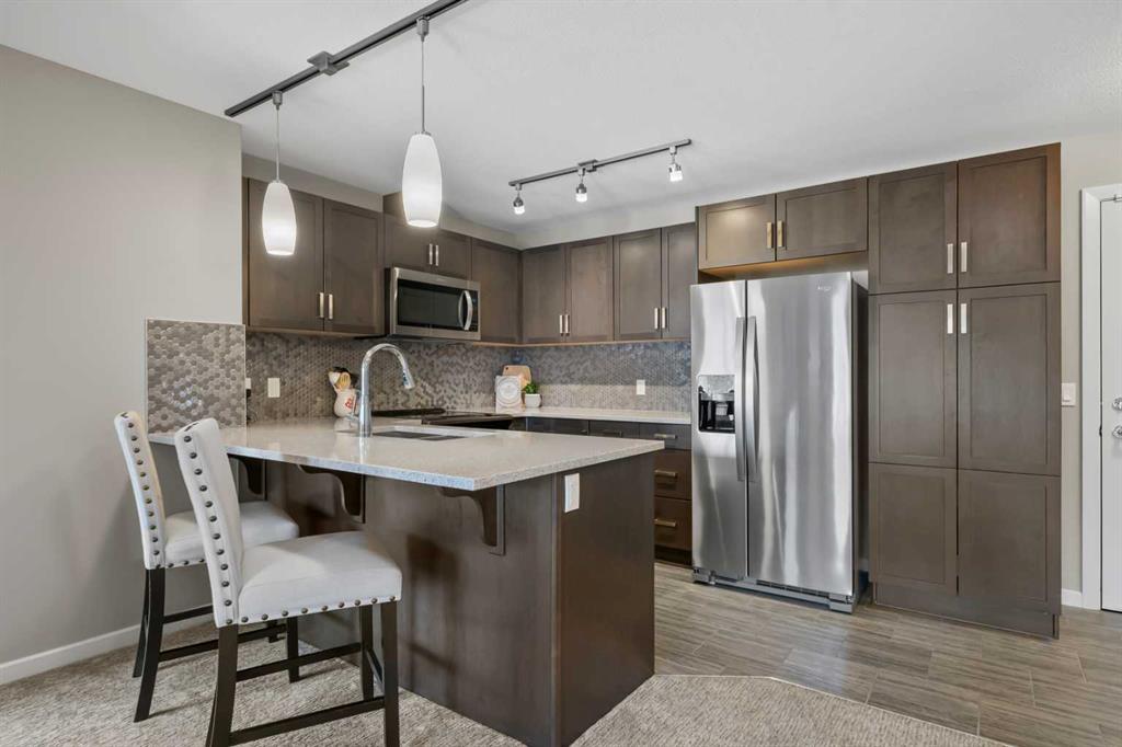 Welcome to The Chateaux! Airdrie\'s premier 55+ condo building in the wonderful community of Kings Heights known for its sophistication, exceptional pride of ownership and unbeatable access to nearby amenities. Upon entering this unit, you\'ll be impressed by the abundance of natural light, enhanced by its south-facing exposure. You\'re greeted by beautiful tile flooring that leads into a welcoming front entrance, where you\'ll find a spacious coat closet with built-in shelves, perfect for storing coats, keys and shoes. To your right is the kitchen, you will love not only the generous counter space but also the ample cabinetry this layout offers. The kitchen features granite countertops, a large sink, a lazy Susan in the corner cabinet, a garburator and a counter overhang for bar stool seating, ideal for casual meals. Stainless steel appliances and a well-appointed pantry with pull-out drawers complete this thoughtfully designed space. Moving into the living room, enjoy a spacious layout complemented by a beautiful custom California Closets media centre that is perfect for your TV, artwork and storage needs. Stay cool in the summer with a wall-mounted A/C UNIT! Your southwest-facing balcony offers year-round afternoon sun, making it the perfect place to enjoy your morning coffee, tea or an evening drink. This balcony was upgraded at the time of construction with glass panels and a gate, offering convenient direct access to the landscaped common areas, especially great for pet owners. The primary bedroom is a dream, with a large south-facing window and a spacious walk-through closet that leads into your ensuite bathroom. The ensuite features a walk-in shower with a built-in seat and elegant glass doors. The second bedroom is impressively sized and bright with custom built-in California Closet organizers that provide exceptional storage and organization. A second full bathroom is located just outside this room, complete with a beautiful vanity and a large bathtub. In-suite laundry is neatly tucked into a dedicated closet with room for storage and laundry supplies. This apartment also features a versatile den to the left of the front door that is ideal for a home office, additional storage or exercise space. For parking, enjoy the convenience of a titled underground stall located just steps from the elevator. In front of your stall, you’ll find a large, secure storage locker. Plus, there’s ample outdoor visitor parking for your guests. The Chateaux features a beautifully landscaped courtyard with a gas fireplace, and an amenity room available for private bookings where residents regularly gather here for social events and happy hours. There\'s also a secure underground workshop for woodworking enthusiasts. Located in Kings Heights, you’re within walking distance to Save-On-Food, Shoppers Drug Mart, banks, salons, restaurants and more meeting all your grocery, shopping and healthcare needs. Call for a private viewing today!