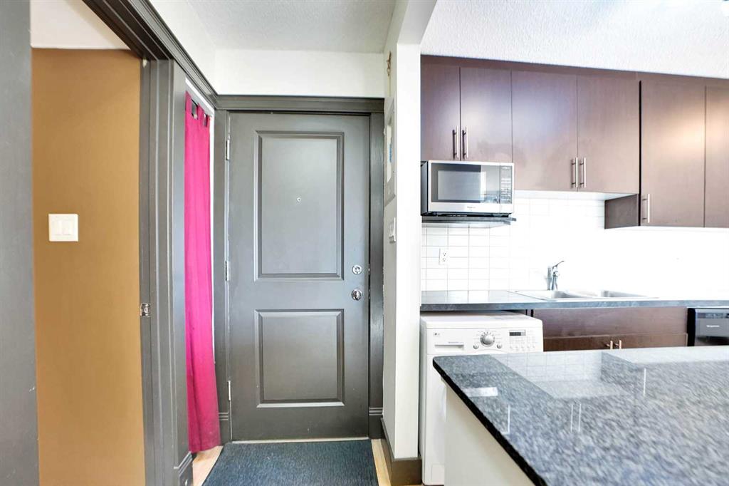 Welcome to this beautiful well cared for TOP FLOOR 1-bedroom south facing condo with in suite laundry, nestled in the vibrant community of Windsor Park—just steps from Chinook Centre, the LRT, parks, shopping, restaurants, schools, and everyday amenities. Inside you will find a bright, open-concept layout. The modern kitchen features granite countertops, wood-stained cabinetry accented by a subway tile backsplash and stainless steel appliances. The living room allows for natural light from the large sliding doors that lead to a private balcony with picturesque views of the surrounding neighborhood. Laminate flooring throughout the kitchen and living room. The carpeted bedroom will accommodate any sized bed and includes a double sliding door closet. The updated 4-piece bathroom boasts a vessel sink, ceramic tile floor, tub/shower and thoughtful details like updated lighting and plumbing fixtures. Enjoy the added convenience of in-suite laundry. Additional highlights include an assigned parking stall with electric plug-in and the peace of mind that comes with a solid concrete, low-turnover, well-managed building. This 4th level unit is move-in ready with quick possession available—an exceptional opportunity to own in one of Calgary’s most convenient and desirable locations.