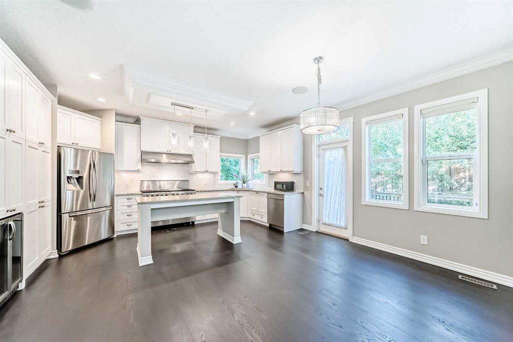 A beautifully refreshed and redesigned home in desirable Aspen Woods! This stunning 2,763 sq ft two-storey combines timeless elegance with modern updates—showing like new! The Chef’s kitchen will impress with its professional-grade gas range, wine fridge, granite countertops, subway tile backsplash, and ample custom cabinetry. The newly refinished hardwood floors throughout the main level add warmth and sophistication to the open layout. Upstairs, the primary retreat features French doors leading to a luxurious spa-inspired 6-piece ensuite with a jetted tub, oversized shower, dual vanities, and a generous walk-in closet. The vaulted bonus room provides the perfect family gathering space, while the fully developed basement offers a spacious recreation room, a guest bedroom, a full bath, and a flex area—ideal for a gym or home office. Additional highlights include 9’ ceilings, granite counters throughout, built-in speakers, designer lighting, crown moldings and a backyard deck surrounded by mature trees—perfect for entertaining or relaxing in privacy.