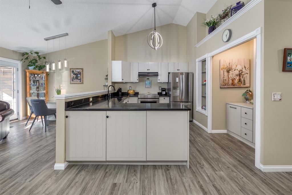 Welcome to this beautifully renovated, fully developed, move-in-ready bungalow villa in the highly sought-after 55+ community of Polo Park in High River, just moments from the Highwood Golf Course and clubhouse. Offering over 1,800 sq. ft. of thoughtfully finished living space and approximately $200,000 in upgrades, this 2+1 bedroom, 2.5 bathroom home with a finished single-car garage blends upscale comfort with effortless living. The bright, open main floor showcases vaulted ceilings, and a stunning chef-inspired kitchen featuring elegant quartz countertops, soft-close cabinetry, abundant storage, and premium appliances including a KitchenAid stove, Bosch dishwasher, and LG refrigerator — perfectly designed for both everyday living and stylish entertaining. Extensive upgrades include new doors and windows, luxury vinyl plank flooring throughout, knockdown ceilings on the main level, custom wrought-iron railing, and a new garage door. The roof was replaced in 2020. Comfort is elevated with central air conditioning, central vacuum, a Lennox furnace (2014), and a new hot water tank (2023). Additional highlights such as Phantom screens, California Closets, a GE washer and dryer, a water softener & Reverse Osmosis system add convenience and refined functionality. A rare opportunity to own a turnkey bungalow in High River’s desirable golf course community.