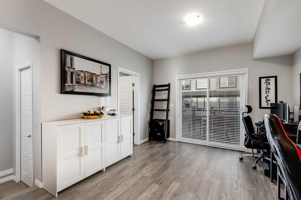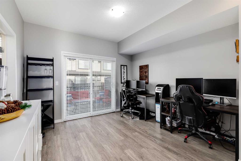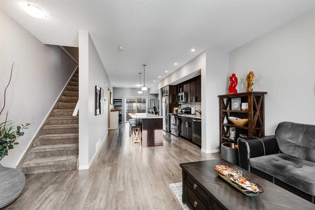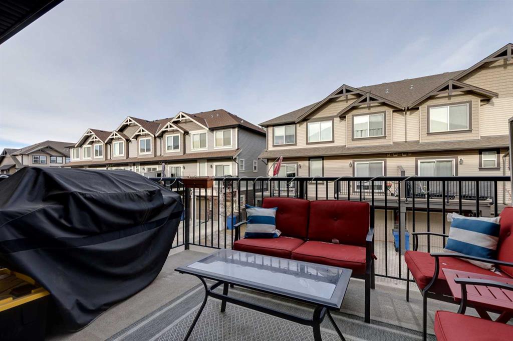 Bright and open 2-bedroom townhome in the community of Williamstown. An excellent value with condo fees that include the Airdrie monthly water and sewer bill. Before you enter you\'ll notice the playground right beside the home, and the visitor parking stalls right in front, making it ideal for guests. The entry level offers a 40\' Long OVERSIZED DOUBLE GARAGE, plus driveway, allowing parking for up to 3 vehicles, plenty of storage, and a rare additional access door from the garage to the back, making taking out the garbage very easy! The open-concept main floor is complete with 9-foot ceilings, upgraded cabinetry, quartz countertops, stainless steel appliances, and an impressive 10 FOOT LONG KITCHEN ISLAND making for lots of counter space. Central AIR CONDITIONING makes this home comfortable all year round. The dining area is large enough for a big table, and with the balcony right here, it makes for the perfect space for entertaining. The living room features an electric fireplace and A main floor half-bath completes this level. Upstairs, the third floor features a large primary suite, including a walk-in closet and a 4-piece en-suite with Double Sinks. The second bedroom is also a great size and features double closets. The upstairs is complete with the main 4-piece bathroom, and UPPER LAUNDRY. In the community of Williamstown you can enjoy the environmental reserves thats just steps away with wetlands, walking paths, playgrounds. You\'re also just a short walk from Herons Crossing K-8 School. Book your showing today!