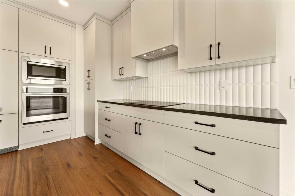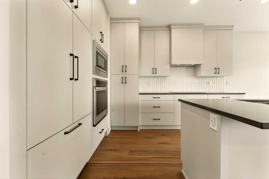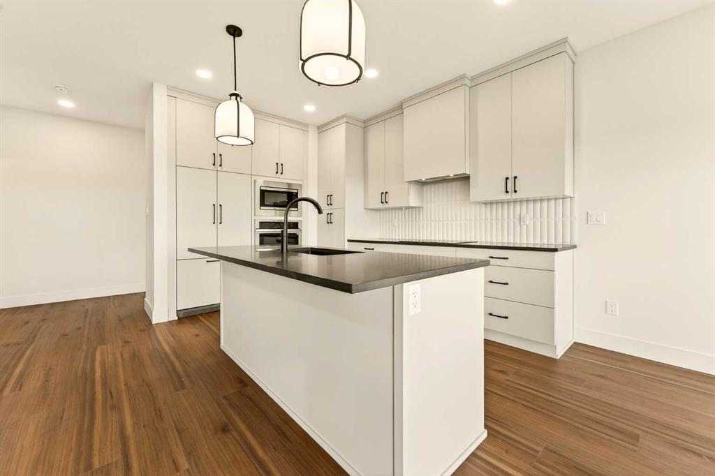 The main floor is bright, open, and intentionally designed to feel both elevated and functional, anchored by a standout kitchen that truly sets the tone for the home. Extended cabinetry runs all the way to the ceiling, paired with quartz countertops and a sleek induction cooktop, while the built-in oven and microwave keep everything clean and streamlined. The panelled Fisher & Paykel fridge and matching panelled dishwasher blend seamlessly into the cabinetry, giving the kitchen a polished, high-end look without feeling overdone. Just off the kitchen, the dining and living areas flow effortlessly together and open to the spacious backyard through sliding glass doors, perfectly positioned for a future deck and indoor-outdoor entertaining.