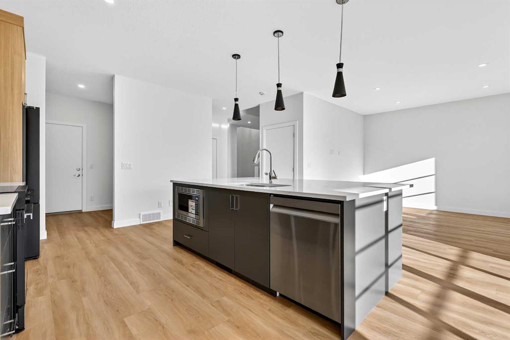 Experience the height of sophisticated living in this highly coveted luxury townhome, where a generous floor plan meets modern comfort and refined finishes. Proudly presented by StreetSide – this thoughtfully designed unit features 3 bedrooms, 2.5 bathrooms, and a front attached double car garage. The heart of the home is a spacious kitchen with a large central island, polished white quartz countertops, upgraded stainless steel appliances, and elegant sliding French patio doors that open to your covered deck area—ideal for both everyday living and entertaining. Light floods into the living room with ease through the large window, while luxury vinyl plank flooring flows throughout the main floor living areas, and carpeted stairs leading to the upper level and bedrooms provide extra warmth. The primary ensuite is a private sanctuary, complete with tile flooring, double sinks, a freestanding soaker tub, and an oversized tile-and-glass shower delivering spa-inspired comfort at home. The unfinished basement with roughed-in plumbing provides future potential for additional living space tailored to your needs. Professional landscaping and fencing complete your new home. Ideally located in the award-winning community of Harmony, residents enjoy Mickelson National Golf Course, private lake amenities, scenic walking and biking trails, and a wellness-focused lifestyle—just a shorty drive from Calgary city minutes and 45 minutes from the Rocky Mountains, where nature and convenience come together effortlessly