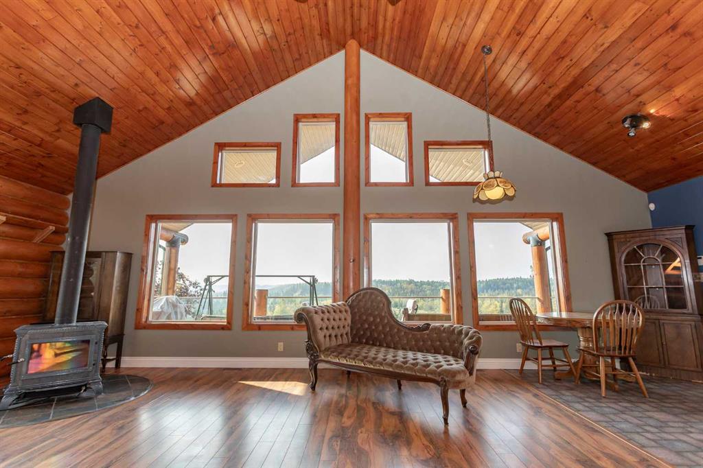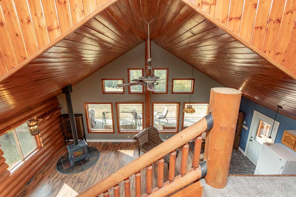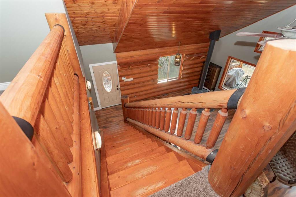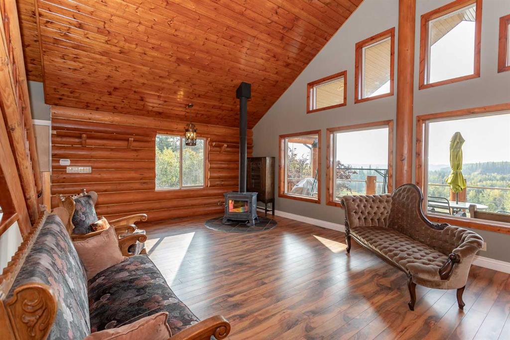 Set on 5.54 acres above the Blindman River, this log-style 1.5 storey home offers a peaceful setting with wide-open valley views and plenty of space to enjoy country living. The main floor is bright and welcoming, featuring a spacious living room with a wood stove, large south-facing windows, and direct access to the full wrap-around deck. The kitchen is practical and inviting with oak cabinetry, laminate countertops, a walk-in pantry, and a comfortable dining area. Two well-sized bedrooms, a 3-piece bathroom with a full tub, and a dedicated main floor laundry room complete this level.