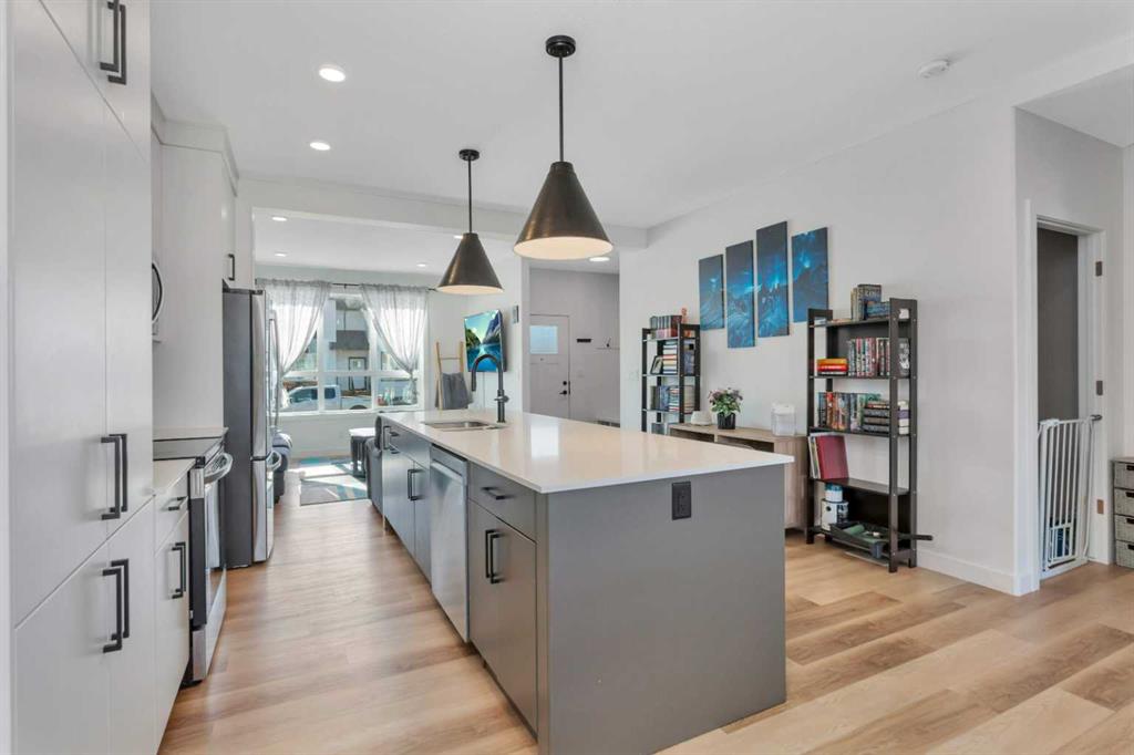 The kitchen truly anchors the home with a massive island featuring extended quartz countertops, perfect for stools, homework time, or late-night chats, plus a built-in pantry and four stainless steel appliances. The expansive dining area easily accommodates a full-size table with room to host, and the separate mudroom with a half bath offers practical family functionality with direct access to the east-facing back deck. Outside, enjoy a fully fenced backyard with rear lane access, two parking stalls, and space for a future single detached garage.