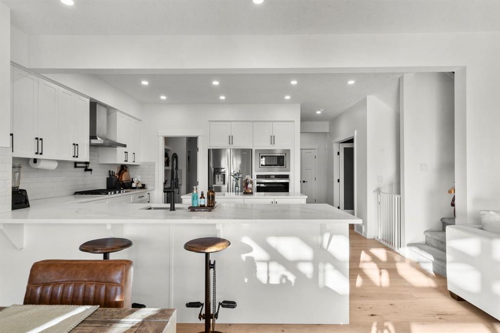 Situated in the sought-after Air Ranch community, this beautiful 2022-built home blends craftsmanship, thoughtful design, and modern comfort across nearly 3,900 square feet of living space. With five bedrooms, including four upstairs, and a main floor office, this residence offers a rare combination of space, flexibility, and function for a busy household. The exterior stands out right away with architectural stone, premium siding, and sleek black triple-pane windows that balance style and energy efficiency. Inside, natural light fills the open-concept main floor while wide-plank hardwood flows throughout. Every finish feels cohesive and deliberate, creating a space that is both welcoming and refined. The kitchen is the centerpiece of the home, designed with quartz countertops, full-height cabinetry, a gas range with pot filler, and a walk-through butler’s pantry complete with a coffee bar. Just off the kitchen, a private office provides a quiet spot for work or study. The living room is warm and comfortable, highlighted by a shiplap fireplace with a solid wood mantel. Large patio doors open to a spacious deck and pergola overlooking a beautifully landscaped, low-maintenance, south-facing backyard, ideal for year-round relaxation or entertaining. Upstairs, four generous bedrooms provide a layout rarely found in homes like this. The vaulted bonus room separates the primary suite from the secondary bedrooms, offering both connection and privacy. The primary bedroom is a true retreat with a spa-inspired ensuite featuring dual sinks, a deep soaker tub, glass-enclosed shower, and private water closet. The ensuite connects directly to a large walk-in closet with convenient access to the upper laundry room. A full bathroom completes the upper level. The finished basement adds even more living space, with nine-foot ceilings, a large recreation area, and an exceptionally spacious fifth bedroom perfect for guests or extended family. A full four-piece bathroom and a clean, well-organized mechanical room reflect the same care that runs throughout the home. Located close to Okotoks’ newest boutique plaza, which will soon feature a café, day care, and other local amenities, this property offers an ideal blend of luxury, lifestyle, and everyday convenience. Every detail, from triple-pane windows to motorized roller shades, was chosen for both comfort and longevity. This home truly stands out for its quality, family-friendly design, and timeless appeal.