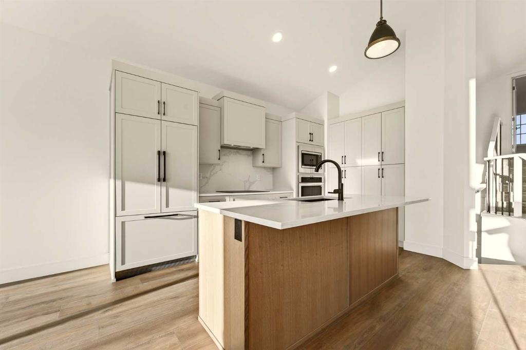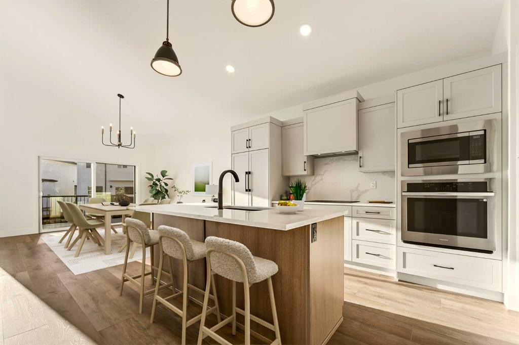 The main floor is designed to impress the moment you step inside, with tall vaulted ceilings that immediately create a sense of openness and scale. The kitchen anchors the space and blends high-end finishes with thoughtful design, featuring quartz countertops, a panelled Fisher & Paykel fridge, a panelled dishwasher that disappears into the cabinetry, an induction cooktop, and built-in oven and microwave. It’s a clean, modern look that feels both elevated and practical. Adjacent to the kitchen, the dining area opens through sliding glass doors onto the finished deck, perfectly positioned to overlook the green strip and expansive backyard.