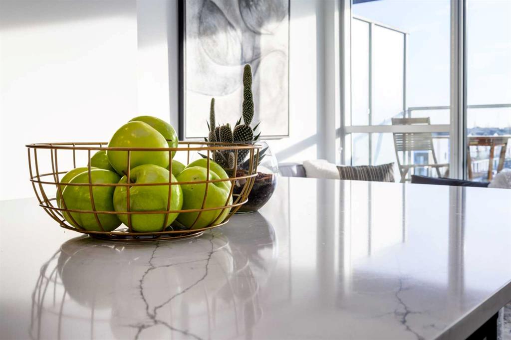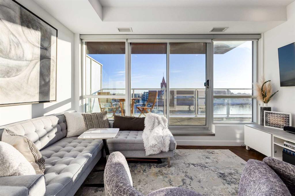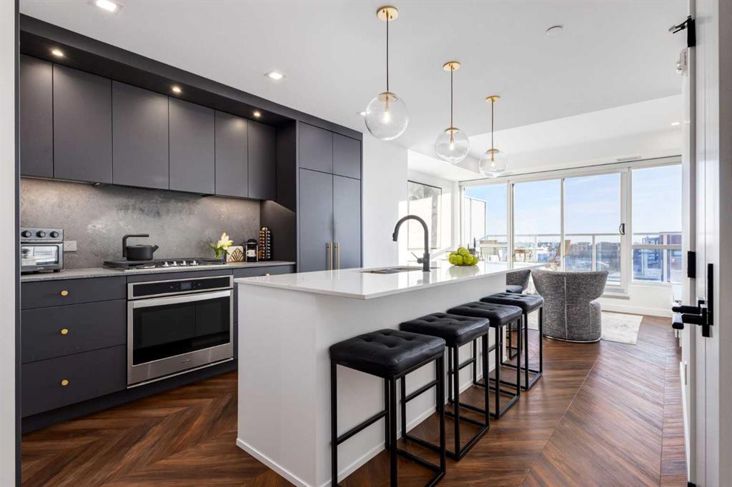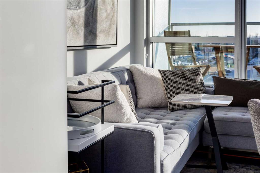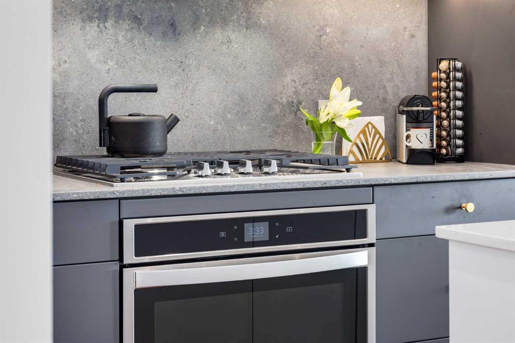 Located in the heart of West District, this bright south-facing two-bedroom, two-bathroom home offers an exceptional blend of privacy, natural light, and outdoor living. One of the few residences in the building with a generously sized patio, it backs onto the beautiful church park, offering views that will always remain open. The home offers 792 square feet of thoughtfully designed interior space, expanding to 962 square feet when including the private patio. The patio is perfect for morning coffee, summer dining, or entertaining, with plenty of room for a BBQ and outdoor seating. The open-concept living and dining areas are filled with natural light from floor-to-ceiling windows. High ceilings and refined painted finishes create a bright and inviting atmosphere. The chef-inspired kitchen features matte grey slate cabinetry with soft-close hardware, brushed gold accents, white quartz countertops, a coordinating backsplash, and premium appliances, including a Whirlpool five-burner cooktop and oven, Elica range hood, and Fisher & Paykel integrated fridge and freezer. The primary suite is a serene retreat, with large windows that fill the room with natural light. The walk-in closet provides ample storage, and the beautifully finished three-piece ensuite features quartz countertops, modern fixtures, and spa-inspired finishes. The second bedroom is spacious and versatile, ideal as a guest room, home office, or creative space, with convenient access to the four-piece bathroom. Additional highlights include an oversized washer and dryer and ample storage throughout. Residents enjoy access to premium amenities, including a rooftop patio, private owner’s lounge, secure underground visitor parking, bike storage, EV charging stations, and concierge services. Ideally located in Calgary’s West District, you are steps from parks, walking paths, boutique shops, cafés, and dining options. A rare opportunity to secure a south-facing home with beautiful views, elevated outdoor living, and exceptional value. Schedule your private viewing today!