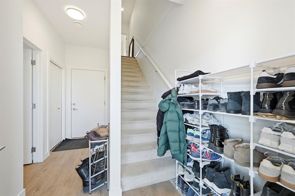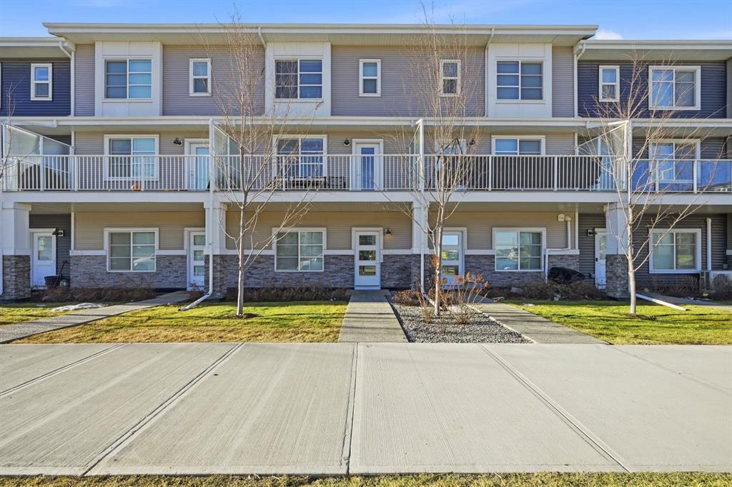 Beautifully upgraded townhome located in the family-friendly community of Carrington NW. Enjoy the convenience of nearby shops, walking paths, and easy access to downtown and the mountains. This modern 4-bedroom, 2.5-bath home offers 1,639 sq ft of thoughtfully designed living space. The main-floor bedroom is extremely versatile and works perfectly as a home office, gym, or guest room. The attached double garage provides secure parking and seasonal storage. The bright, open-concept second level is perfect for both daily living and entertaining. Large windows bring in plenty of natural light, while the upgraded kitchen features quartz countertops, stainless steel appliances, and ample storage. The living area opens onto a private balcony, great for morning coffee or relaxing in the evening. Upstairs offers three well-sized bedrooms, including a spacious primary suite with a walk-in closet and private 4-piece ensuite. Two additional bedrooms, a full bathroom, and upper-floor laundry add everyday convenience.