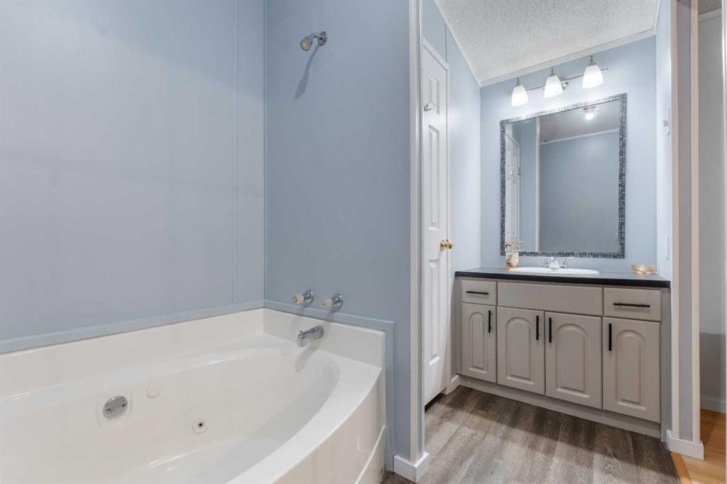 Bright and Open. This family has been updating this home. In the summer of 2025, the roof was redone professionally, and a new living room glass was installed in January. The kitchen cabinets were repainted, floors replaced, and some appliances are also recent. The living room includes a cozy electric fireplace with a mantel. Calm and relaxing colours. The primary bedroom features a walk-in closet and an en-suite bathroom with a large soaker tub adjacent to the separate water closet. Total of 3 bedrooms and 2 full baths. A fully fenced yard, located at the back of the cul-de-sac, is chain-link and is pie-shaped for a large backyard.