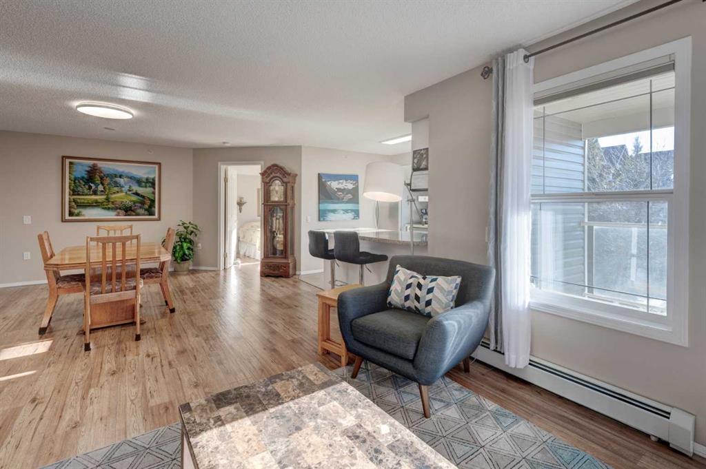 Premium location for this bright, spacious 3rd-floor end unit with no neighbours above! One of the largest units in this well-managed Adult 60+ community, this 2-bedroom, 2-bathroom home offers an excellent open-concept layout with extra South and West facing windows flooding the home with an abundance of natural light. The U-shaped kitchen is generous in size with granite countertops, a large peninsula, white cabinets and pull-outs, and newer stainless-steel appliances. The living and dining areas feature a large open space for added comfort and ambiance, along with electronic blinds and laminate flooring running throughout most of the unit. The primary bedroom includes a private 4-piece ensuite with walk thru closet, while a 3-piece main bath is perfect for guests off the second bedroom. Additional highlights include a large covered balcony, tiled entry, in-suite storage with newer stand-up washer and dryer, jacuzzi tub, towel warmer, quartz bathroom countertops, and a titled heated underground parking stall. Enjoy an exceptionally active and welcoming community or simply relax in the comfort of your own home. Building amenities span multiple floors and include a dining room, Café Bistro, lounge, craft room, exercise room, hair salon, library, guest suite, rooftop, and a carwash. Did I mention a chef Mon-Fri for dinner? Condo fees include heat, water, and electricity. A mandatory $75/month dining fee applies for weekday meals. Public transit is conveniently located , with shopping, restaurants, and health services just steps away. The LRT station is adjacent to the complex, making commuting effortless. This impressive unit truly offers comfort, convenience, and community…a must-see!