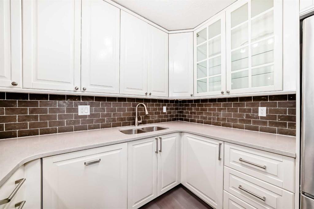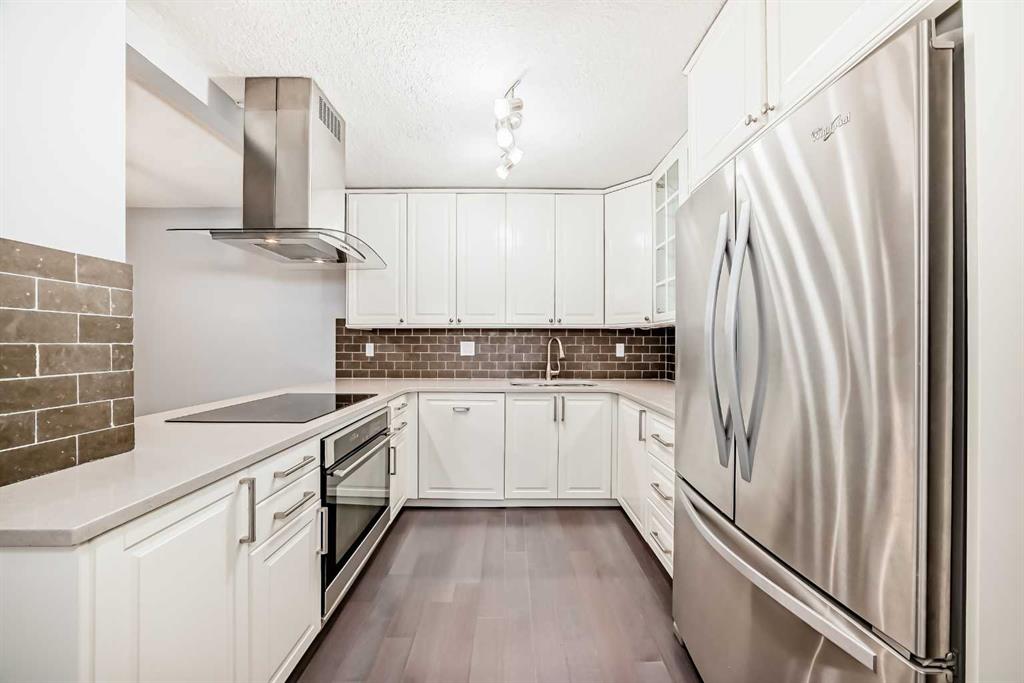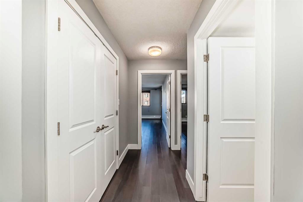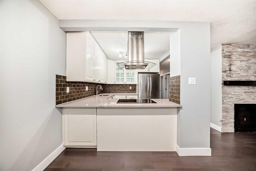 Experience inner-city living at its finest in this beautifully renovated condo offering breathtaking city views. Thoughtfully updated with the urban executive in mind, this residence showcases a sleek, modern design throughout. The kitchen is a standout, featuring quartz countertops, upgraded stainless steel appliances, a stylish upgraded faucet, and newer cabinetry that seamlessly flows into a spacious dining area—perfect for hosting. The generously sized living room is warm and inviting, highlighted by hardwood flooring, a natural gas fireplace, and patio doors that open to the outdoors, creating an ideal space for both relaxing and entertaining. This home offers two large bedrooms, including a spacious primary retreat complete with a walk-in closet featuring custom built-ins and direct access to the impressive 22-foot oversized balcony. The fully renovated four-piece bathroom is finished with a contemporary vanity and modern touches. Additional conveniences include a large in-suite storage room with washer and dryer, knockdown ceilings, updated lighting, and fresh paint throughout. Residents also enjoy access to a spectacular rooftop patio with panoramic 360-degree city views. The parking stall is exceptionally well-located as an end space, offering ample clearance and accommodating oversized vehicles. Lovingly maintained and move-in ready, this exceptional condo is truly a rare find. Call today to book your private viewing of this inner-city gem.