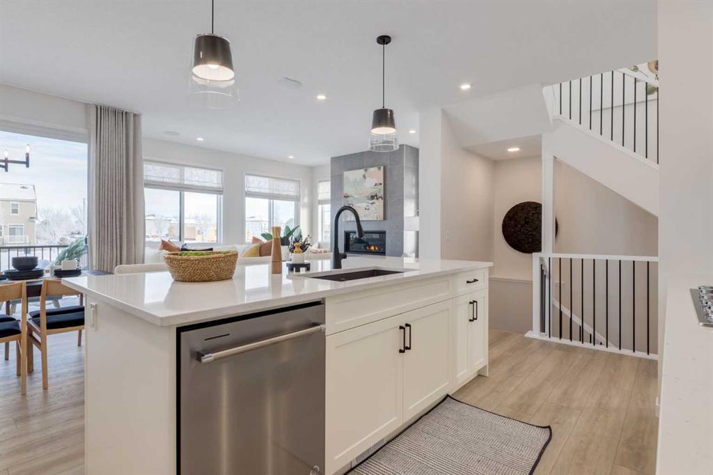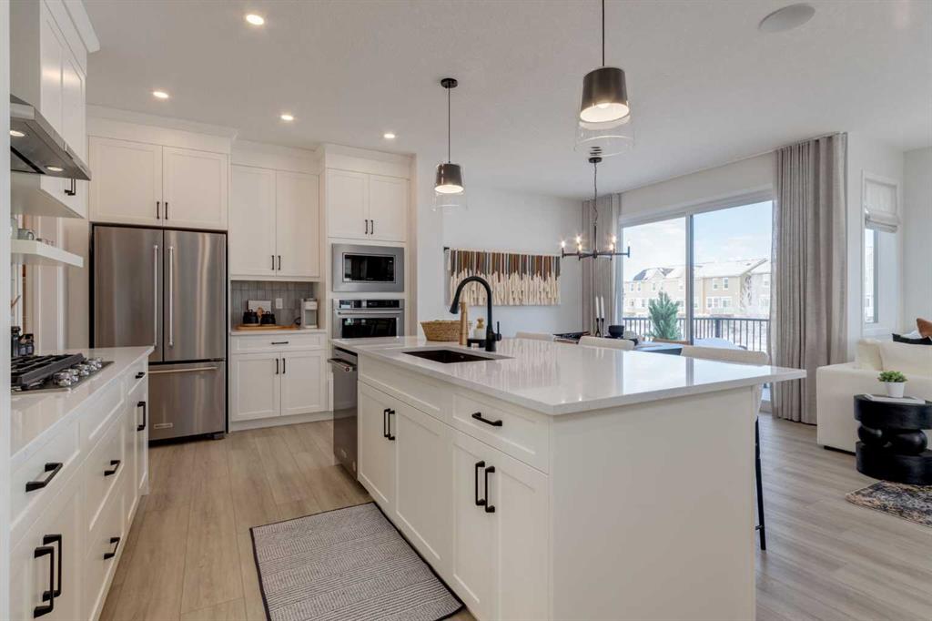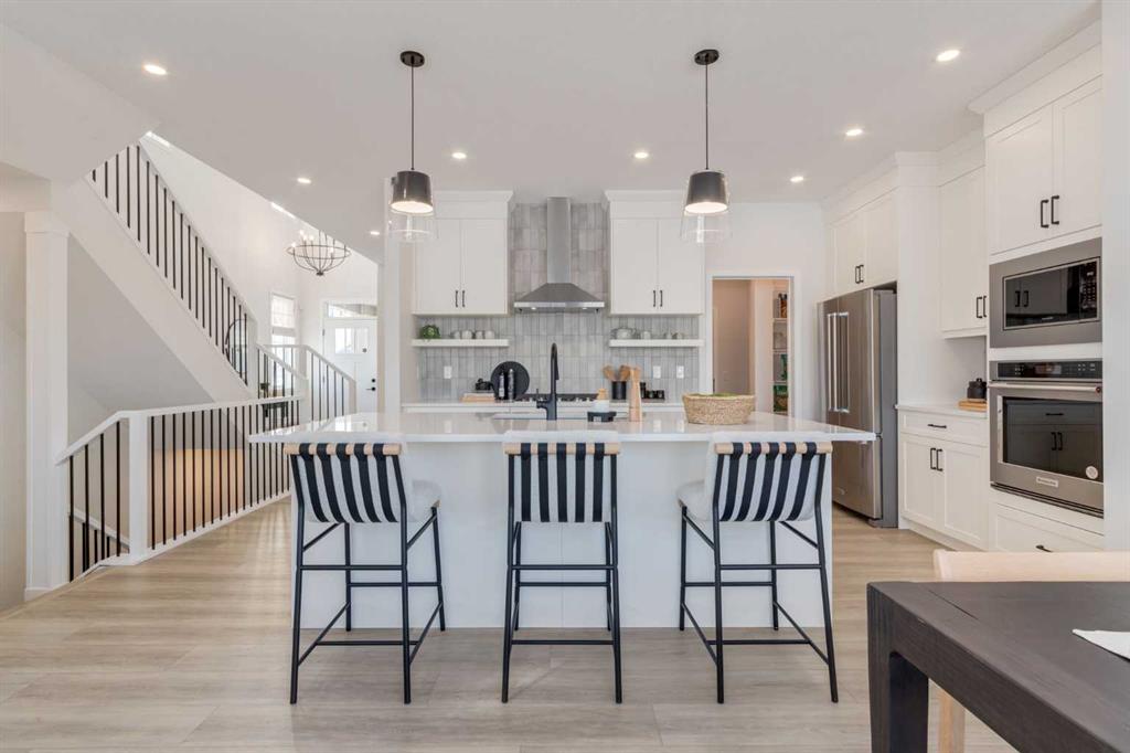 Meet The Strickland—a thoughtfully designed 2,093 sq. ft. home that blends everyday function with elevated finishes. With 3 bedrooms, 2.5 baths, a double attached garage, and a rear wood deck, this plan is built for modern family living and easy entertaining. A grand entryway makes a great first impression, paired with an oversized front closet that keeps coats, boots, and gear out of sight. At the back of the home, the mudroom with built-in locker creates the perfect drop zone for backpacks and busy routines. The main floor is designed around connection, with a centralized kitchen that links the living and dining areas so you can cook, visit, and relax in one open, welcoming space. The gourmet kitchen upgrade is the showpiece: full-height cabinetry, quartz countertops, two sets of pot & pan drawers, and a statement chimney hood fan framed by open shelving and finished with a tile backsplash to the ceiling. The premium KitchenAid appliance package includes a built-in wall oven & microwave, 5-burner gas cooktop, French door/bottom freezer fridge, and dishwasher. An oversized island is highlighted by upgraded matte black pendant lighting, and a smart walk-through pantry keeps clutter tucked away and grocery days simple. Luxury vinyl plank flooring spans the main level, with upgraded windows and an electric fireplace adding warmth. Upstairs, the thoughtful plan continues. A vaulted bonus room becomes your private family hub—movie nights, a kids’ lounge, or a quiet retreat away from the main level. Second-floor laundry is centrally located to simplify day-to-day life. The front kids’ wing features two spacious secondary bedrooms with easy access to the family bath, while the primary suite is a true escape with a large walk-in closet and a spa-inspired 5-piece ensuite with generous vanity space and storage. Outside, enjoy summer evenings and weekend BBQs on your rear wood deck and appreciate the durability and curb appeal of a Hardie board exterior. Modern details continue with metal railings on the stairs and upper floor. Future-focused features include solar-ready infrastructure with 200-amp service, a 64-panel breaker, and conduit to the roof. Montrose is a master-planned community on High River’s south side with parks, pathways, and a signature pond—great for walks, biking, and year-round time outdoors. Enjoy quick access to schools, recreation, and everyday amenities. A home that’s stylish, bright, and built around real life—The Strickland is one you’ll want to experience in person. **Photos are from the show home/previous builds to demonstrate quality of construction & finishes and may not be an exact representation of this home**