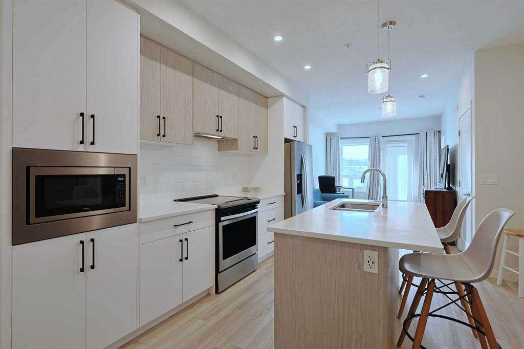 Welcome to Q AT SAGE HILL QUARTER & this sun-drenched 1 bedroom + flex room home in Morrison Homes’ popular condo project in Sage Hill. This fantastic 4th floor unit in the Q-One building enjoys upgraded vinyl plank floors & quartz countertops, 2 full bathrooms, covered balcony & titled underground parking stall for your exclusive use. Complemented by high ceilings, this terrific home has a super open concept layout featuring a sunny & spacious living room & dynamite designer kitchen with 2-toned cabinets & centre island, loads of counter space & Whirlpool stainless steel appliances. The bedroom is a great size & has a walk-in closet & ensuite with shower & quartz counters. The 2nd full bath – also with quartz counters, is right next to the flex room…which is perfect as your home office, or with the addition of a barn door can be converted into a 2nd bedroom. Insuite laundry room with stacking Whirlpool washer & dryer. The covered Southwest-facing balcony has a gas line for your BBQ. In the underground parkade is your titled parking stall, which is just steps from the storage room with your titled storage locker. Monthly condo fees in this pet-friendly complex (with board approval) include heat & water-sewer. The Sage Hill Quarter retail center is right next door…with its restaurants & services, day care, Shoppers Drug Mart & grocery. Only minutes away is the massive Sage Hill Crossing which includes a Walmart Supercentre, TnT Supermarket, Dollarama, Bulk Barn, Value Village, Planet Fitness, bottle depot, restaurants, banks, medical clinics & more! With its quick access to major roadways (144 Avenue/Shaganappi/Sarcee/Stoney/Deerfoot Trails, Symons Valley Parkway & Road), your new home is just minutes to regional parks & recreation, the airport, Cross Iron Mills, University of Calgary & downtown.