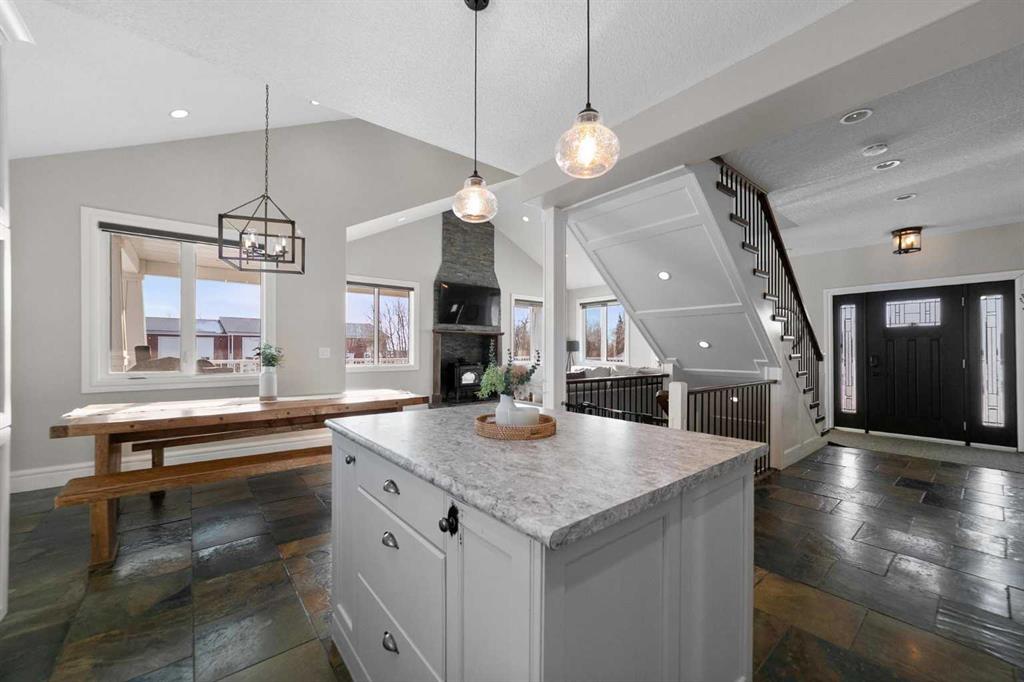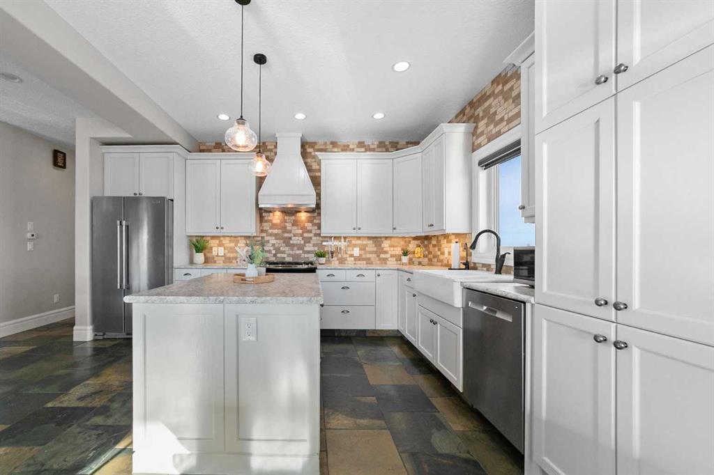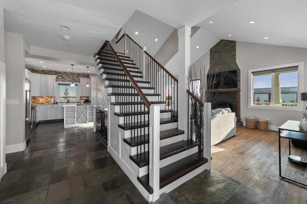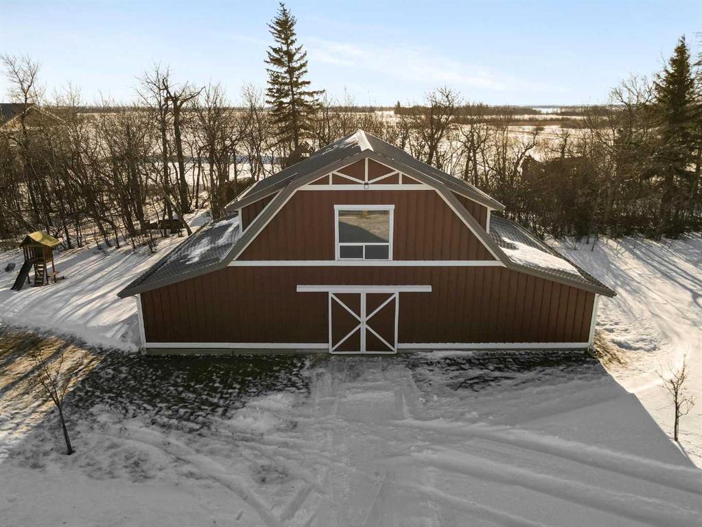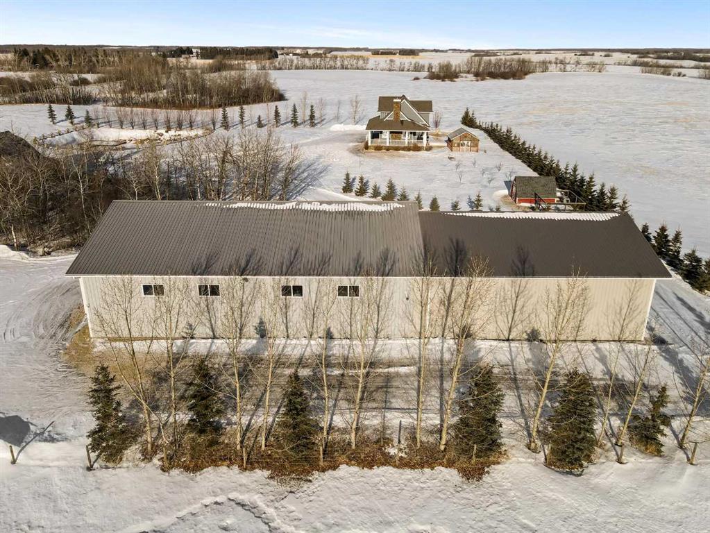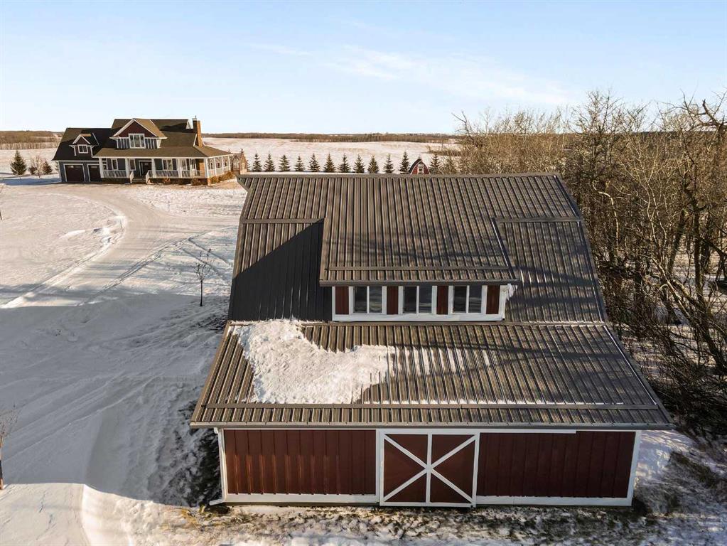 Stunning 2014-built 5-acre parcel featuring an immaculate two-storey home with 6 bedrooms and 3 baths, attached 2-car garage and an incredible heated shop. The property is fully equipped for country living with a barn, greenhouse, chicken coop, dugout with dock, landscaped yard, fencing, firepit area, a graveled drive, lush lawn and maturing trees. The house is wrapped with a covered porch, craftsman detailing and quality finishes. Every detail of the home has been looked after and designed with care. The main floor has a beautiful hardwood stair central to the open living space, vaulted ceilings, large efficient windows, clean and bright kitchen with island, engineered wood floors, featured wood burning stove (not connected), full bath, bedroom, main floor laundry, and a mud room area connected to the fully finished & heated garage. The second floor overlooks the first with an open landing, a second bedroom, and the impressive primary suite with cathedral ceilings, lush carpet, walk in closet, and ensuite with double sinks, soaker tub, and glass enclosed shower. The basement is set up perfectly for family entertainment with a large central recreation area, 3 additional bedrooms and another full bath with double sinks. The mechanical space houses a 300 ga cistern, tankless water heater, sump pump, high efficiency furnace with A/C, and rough-in plumbing for in-floor heat. The home is serviced with a well drilled in 2014, and 2, 1450 ga septic tanks with open discharge. The massive 5456 sq.ft. shop is cladded in both composite and metal siding and the yard surrounding it is generously graveled with concrete aprons outside the doors. The shop is fully insulated and finished with wood sheathing, concrete slab, plumbed with a bathroom, serviced with a rainwater cistern and jet pump, and has a dedicated septic holding tank. There is a mezzanine at one end for additional storage or living space. The property also has a new barn, ready for animals, with lean-tos on both sides for shelter or storage. This is a one-of-a-kind acreage - truly a rare opportunity for those seeking space, privacy, and versatility.