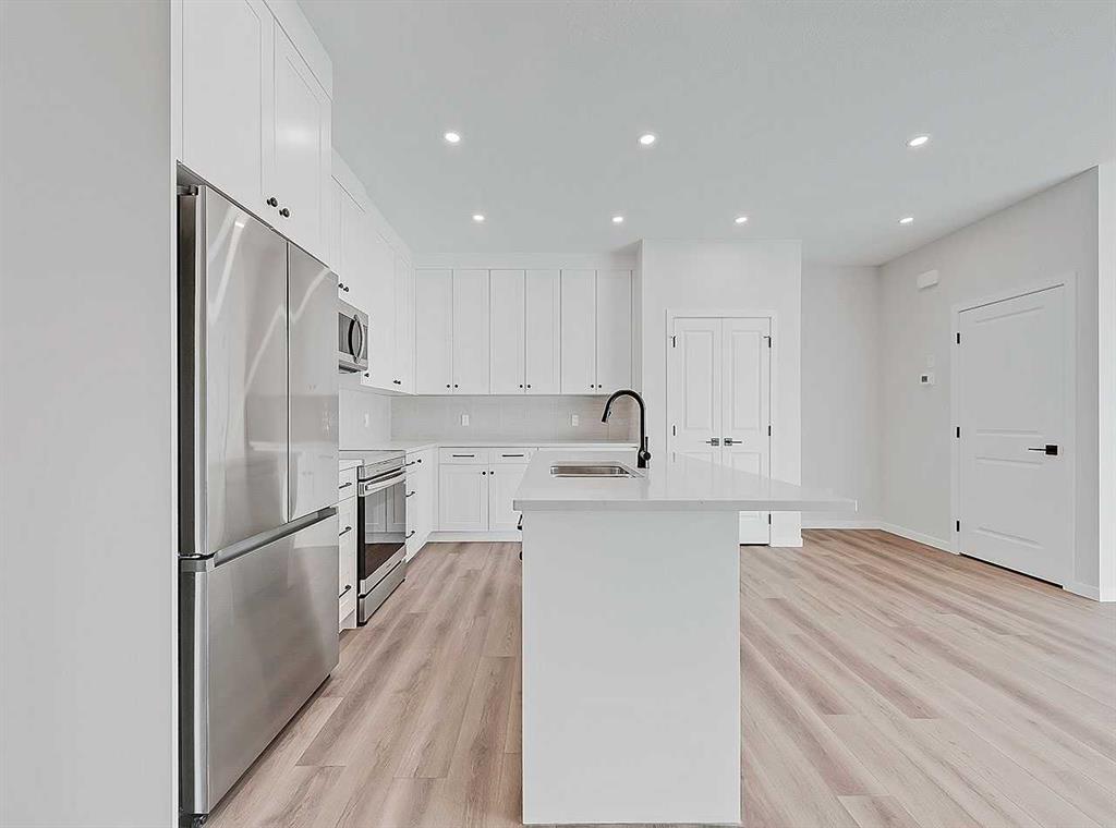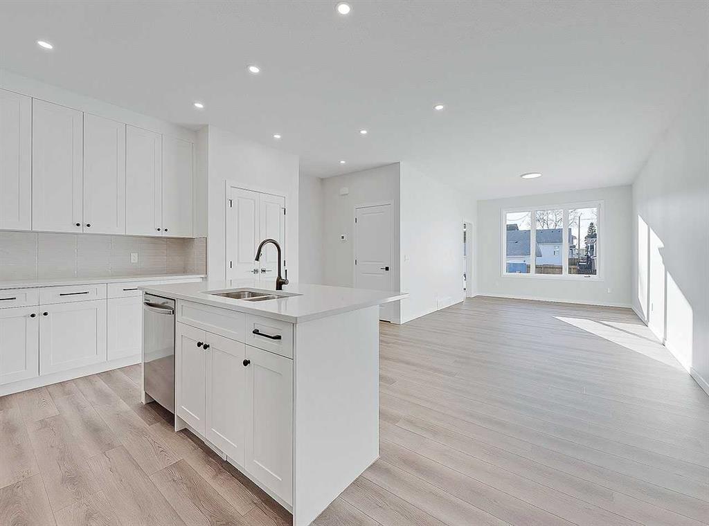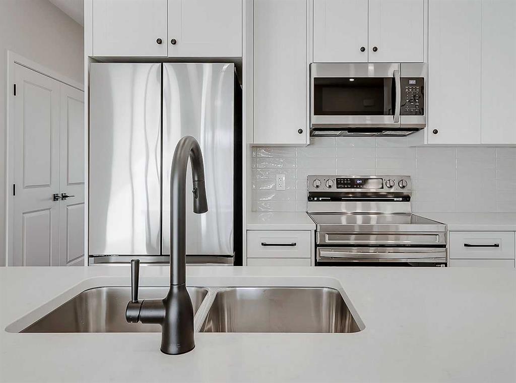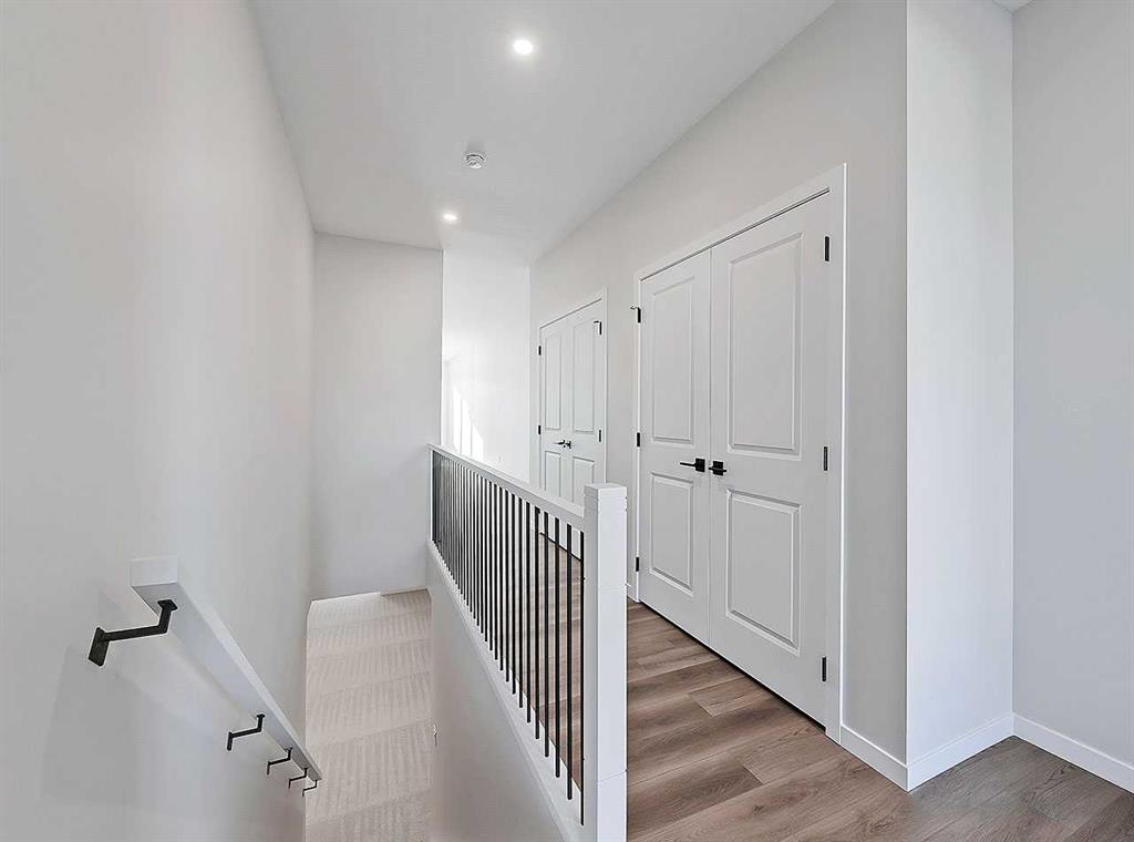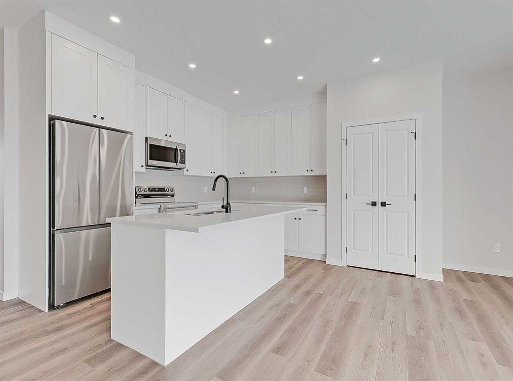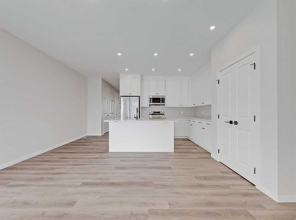 Inside, the home immediately impresses with elevated finish selections and a thoughtfully optimized layout designed for exceptional main-floor living. The stunning front entry features a custom-built railing, 9’ ceilings, an 8’ triple-pane door, and two walk-in closets offering ample storage. The chef-inspired kitchen showcases ceiling-height cabinetry locally crafted in Airdrie, all custom-made with soft-close technology, and paired with a fully upgraded premium appliance package. Timeless 3cm quartz countertops are featured throughout the home, creating a cohesive and elegant finish.