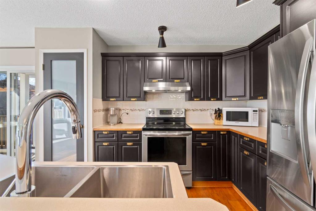 Located on a quarter acre lot in the heart of Langdon, this beautifully crafted bungalow offers space, comfort, and timeless character in a walkable, family-friendly setting close to schools and everyday shopping. A charming wrap-around porch welcomes you home and sets the tone for the quality and warmth found throughout. The main floor features a very open and inviting floorplan, ideal for both daily living and entertaining. The spacious living room is anchored by a cozy gas fireplace and enhanced by a large bay window that overlooks the expansive backyard. The kitchen is thoughtfully designed with abundant dark cabinetry, ample counter space, stainless steel appliances, a built-in pantry, and a central island with a raised breakfast bar. Adjacent to the kitchen is a sunny dining nook with another bay window, filling the space with natural light and offering lovely backyard views. Three well-appointed bedrooms are located on the main level, including a large primary suite complete with a walk-in closet and a private three-piece ensuite bath. While the other 2 bedrooms are steps away from the 4 piece bathroom and a dedicated laundry room offers excellent storage and a convenient utility sink. Rich wood flooring, custom built-ins, and detailed woodwork throughout the main level add warmth and character to the home. The lower level offers endless possibility and is developed with a large family room, two additional bedrooms, a den / play area and a three-piece bathroom. Outside, the oversized lot truly shines. The extra-long driveway easily accommodates multiple vehicles or an RV. The backyard is expansive and well equipped with a deck, pergola, two storage sheds, and plenty of room for kids, pets, or future landscaping ideas. This is a rare opportunity to own a spacious bungalow with classic craftsmanship, incredible outdoor space, and a prime Langdon location.