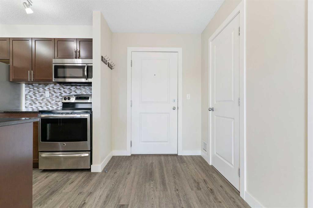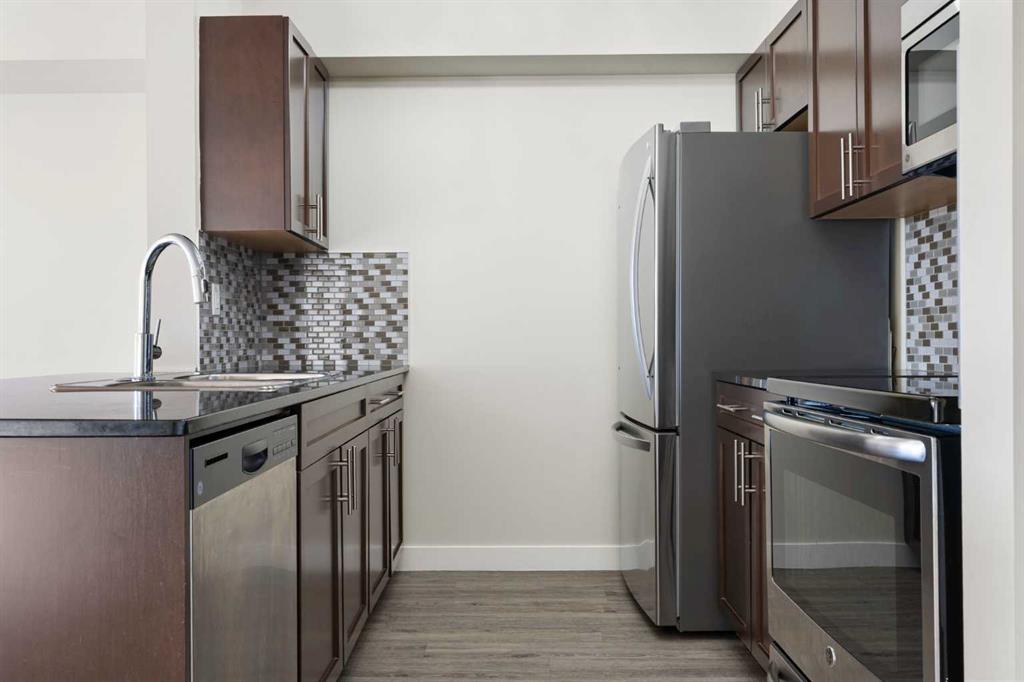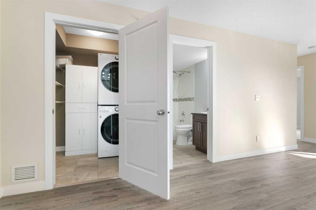 Top Floor | 2 Beds | 2 Baths | Air Conditioned | U/G Storage | 2 Surface Parking Stalls | Pets ok | Experience top-floor living with amazing panoramic views in this beautiful, air-conditioned unit at Glenbow Landing. This meticulously maintained home features a fabulous open layout enhanced by durable vinyl plank flooring. The chef-inspired kitchen offers granite countertops, a breakfast bar, stainless steel appliances, and abundant prep space. It flows seamlessly into a dining area large enough for a substantial table and a bright, inviting living room. Step through the sliding glass doors to your private balcony to take in the scenery. The primary retreat easily accommodates a king-size set and boasts a 4-piece ensuite with granite finishes. A generously sized second bedroom and another full 4-piece bathroom (also with granite) make this unit perfect for guests or a home office. For added convenience, the dedicated laundry room offers significant in-suite storage. Value-added bonuses: Two side-by-side parking stalls (with plug-ins). A massive titled storage room in the underground garage. Pet-friendly (1 dog under 15kg or 2 cats, subject to approval). Book your showing today to see why Living in Cochrane is Loving where you Live.\"