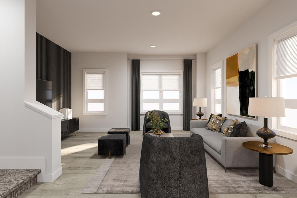 The main living level is organized with intention, not guesswork. The living room sits at the front of the home, anchored by END-UNIT WINDOWS that pull in EXTRA LIGHT and give the space real presence. The kitchen holds the centre, grounded by a BREAKFAST BAR ISLAND with space to prep, perch, eat, and linger, without turning the room into an obstacle course.
