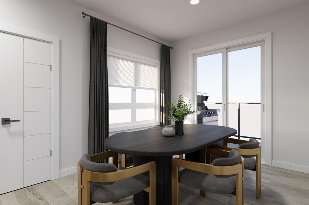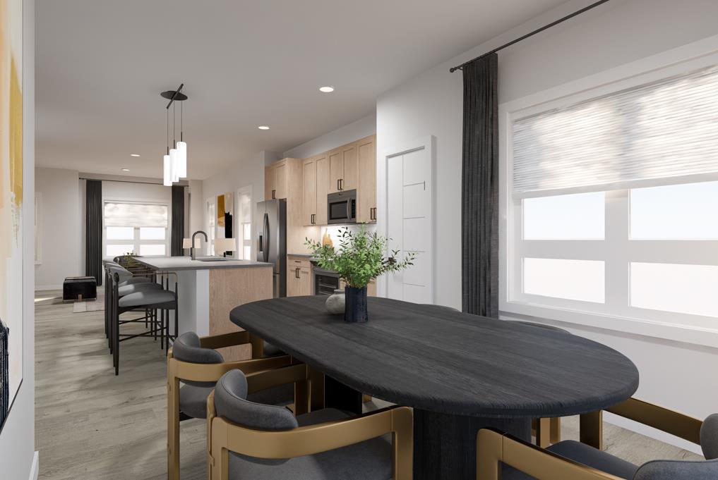 At the back, the dining area opens directly to the PATIO, creating a natural extension of the space. From here, the view opens to COMMUNITY GREEN SPACE AND PATHWAYS, adding visual breathing room and an outdoor connection that makes the patio feel like a true part of daily life — not an afterthought.