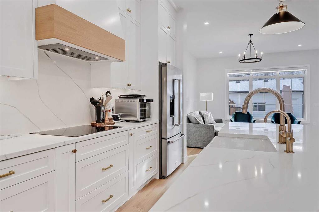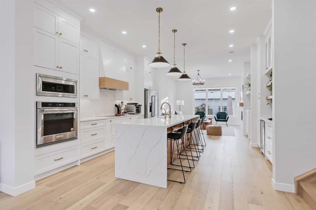 The main floor is flooded with natural light and finished with wide-plank hardwood flooring throughout. The living room is anchored by custom built-ins, wainscotting, electronic blinds, and a sleek gas fireplace, creating a warm and inviting focal point. The kitchen is a true showpiece, featuring full-height white cabinetry with oak accents, quartz countertops, premium stainless steel appliances, including an INDUCTION cooktop, INSTANT HOT WATER tap, and a large island with seating. A statement apron-front farmhouse sink adds both character and function, while open shelving and thoughtful storage keep the space feeling clean and intentional. The open dining area sits beside oversized windows overlooking the front yard, making the entire main floor feel bright, connected, and ideal for entertaining.