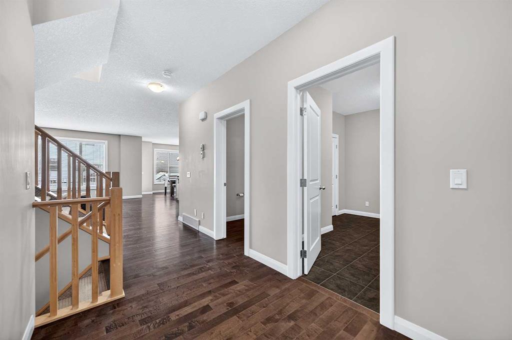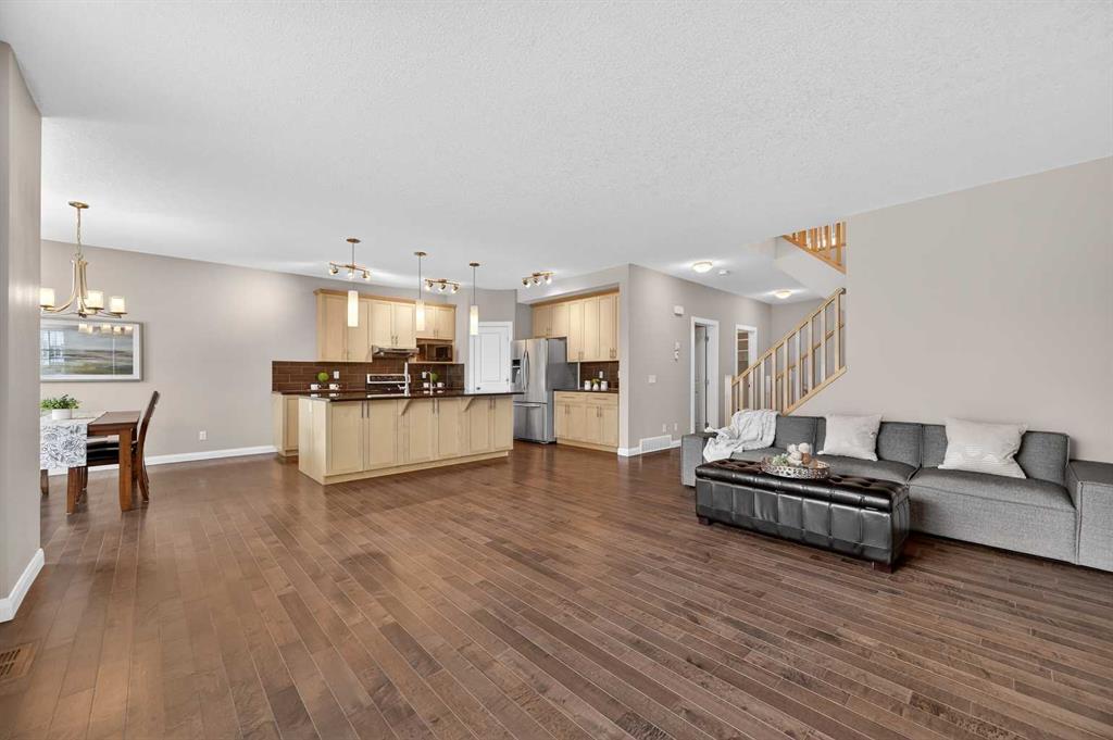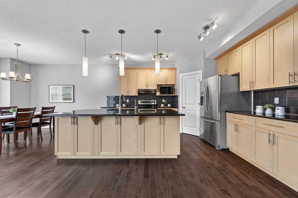 OPEN HOUSE SAT. 2-4. This stunning Broadview-built two-storey home is located in the highly sought-after community of Silverado and offers an impressive 3,350 sq. ft. of fully developed living space with FOUR BEDROOMS AND A FINISHED BASEMENT. The open-concept main floor showcases 9’ ceiling, gleaming hardwood floors, wide hallways, a bright and spacious living room filled with south-facing windows, and a chef’s kitchen featuring custom maple cabinetry, granite countertops, and a large island ideal for both everyday living and entertaining. From the dining area, step out onto a massive two-level deck overlooking a fully fenced backyard with cobblestone pathways, BBQ gas line, and a beautiful vegetable garden. Upstairs, the bright and spacious bonus room is ideal for family gatherings, while the south-facing primary bedroom boasts a luxurious ensuite with double vanities, separate shower, and deep soaker tub. Two additional generously sized bedrooms, a 4-pc full bath and a convenient computer/work area complete the upper level. The fully finished basement with 9’ ceiling offers exceptional versatility with a large recreation area featuring a mirrored wall for a gym or dance studio, an additional bright bedroom with a south-facing window, a den perfect for a home office or hobby room, and a 4-pc full bathroom. Thoughtfully maintained and upgraded, this home features a new roof and siding (2022) and a new double garage door (2025). Ideally located within walking distance to three schools and pathways, just a 7-minute drive to shopping, the library, and the YMCA, and with the world-renowned Spruce Meadows Equestrian Centre as its western neighbor, this home also offers quick access to Stoney Trail and Macleod Trail, providing an easy commute to the mountains —making it a rare opportunity not to be missed.