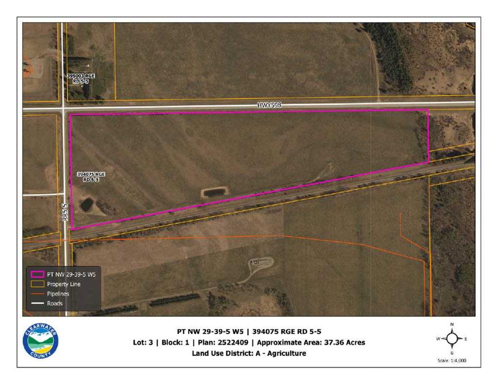 Bigger than your average acreage, this 37 acre parcel along Hwy 598 is zoned Ag with lots of potential for a small hobby farm. There is some perimeter fencing, the owners used electric fence in the past to rotationally graze cattle, and a dugout on the west side. There\'s also an existing lease road leading to an In Play Energy surface lease that generates $4200/year but it is slated to be reclaimed through the Orphan Well Program (will likely be a few years before that is completed). A second approach is in place along the west municipal road. Note the taxes have not yet been assessed and the property line extends further east than the fence line.
