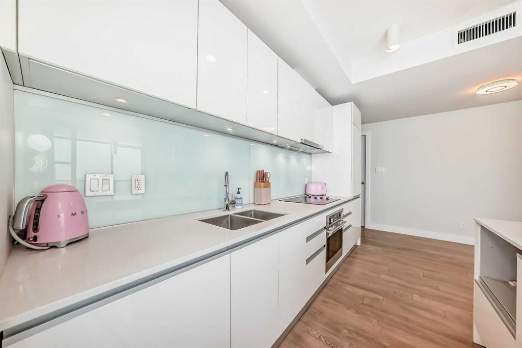 Experience elevated downtown living at The Guardian! Located on the 34th floor, this bright and beautifully designed 2-bedroom, 2-bath condo captures sweeping city views and a dynamic urban backdrop from one of Calgary’s most recognizable high-rise communities. The open layout is anchored by a modern, European-style kitchen featuring integrated appliances, streamlined cabinetry, under-cabinet lighting, and a large island that naturally connects the kitchen, dining, and living spaces. Floor-to-ceiling windows bring in abundant natural light and showcase the cityscape, creating a welcoming environment ideal for both everyday living and entertaining. The primary bedroom offers a comfortable retreat with a private 4-piece ensuite, while the second bedroom is versatile and conveniently located near a sleek 3-piece bathroom with a walk-in glass shower—perfect for guests, roommates, or a home office. Additional conveniences include in-suite laundry, a private balcony with impressive views, titled underground parking, and assigned storage. Residents of The Guardian enjoy an outstanding selection of amenities, including a fully equipped fitness centre, yoga studio, social and games rooms, resident lounge, workshop, garden terrace, secure bike storage, and 24-hour concierge service. Positioned just steps from Stampede Park, the Saddledome, East Village, Central Library, and some of downtown Calgary’s best restaurants, shops, and entertainment, this home offers a connected and effortless urban lifestyle. Don’t miss the opportunity to own a high-level residence in one of the city’s premier downtown location!