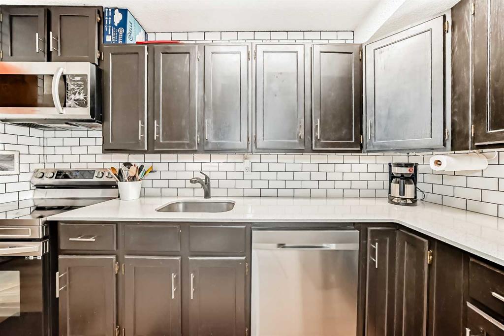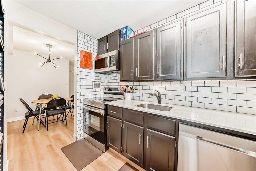 Welcome to Unit 4105 of Southampton Green -- a thoughtfully renovated 1-bedroom, 1-bath MAIN FLOOR condo unit in a quiet location within the complex. Updated in 2023 with quartz countertops, subway tile backsplash, new kitchen appliances, under-cabinet lighting, and plumbing fixtures. The unit features a bright and functional layout with vinyl plank flooring throughout for a clean and cohesive look. The tiled fireplace adds a cozy ambiance in the living room. Storage is never an issue with in-suite storage room plus two additional outdoor storage rooms on the 15 ft. x 6 ft. south-facing patio. Enjoy the expansive green space across the patio ideal for relaxing or soaking up the sun. Condo fees cover heat, water, trash, common area maintenance, professional management, and reserve fund contributions. The complex offers excellent amenities including playground, party room, basketball court, tennis court, table tennis, fitness room, and visitor parking. This unit comes with one assigned, plug-in, parking stall. Centrally located with easy access to major routes and everyday essentials -- minutes to Anderson LRT, South Centre/Chinook Mall, numerous schools and parks. This property offers convenience, comfort and enjoyment.