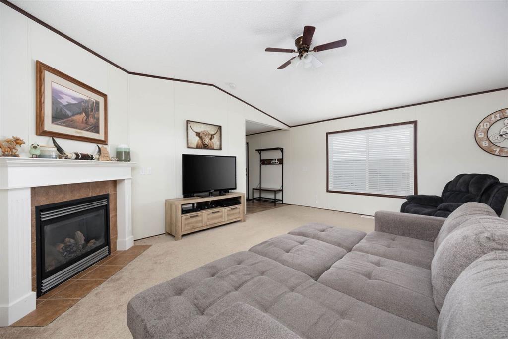 Inside, you’re welcomed by a generous foyer that leads to three well-sized bedrooms at the front of the home and a 4-piece bathroom. The large living room is filled with natural light and features a cozy gas-burning fireplace that flows seamlessly into the dining area and kitchen. The kitchen features rich, dark cabinetry and ample counter space - ideal for both everyday living and entertaining.